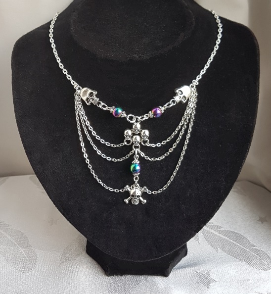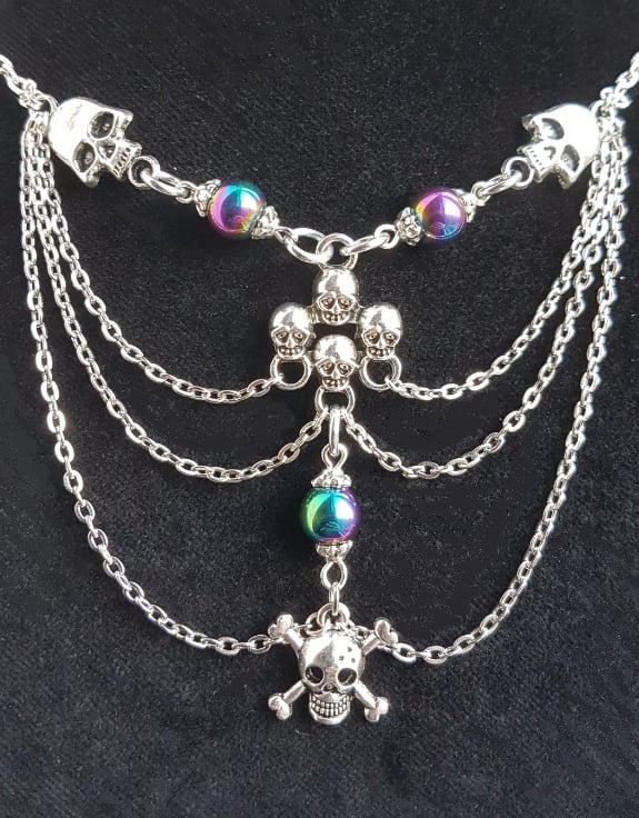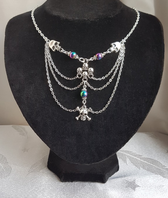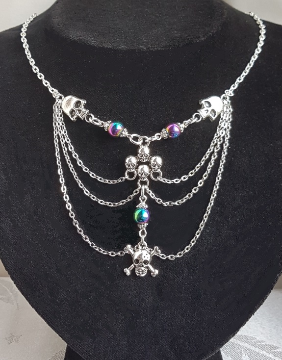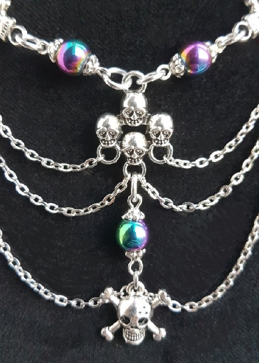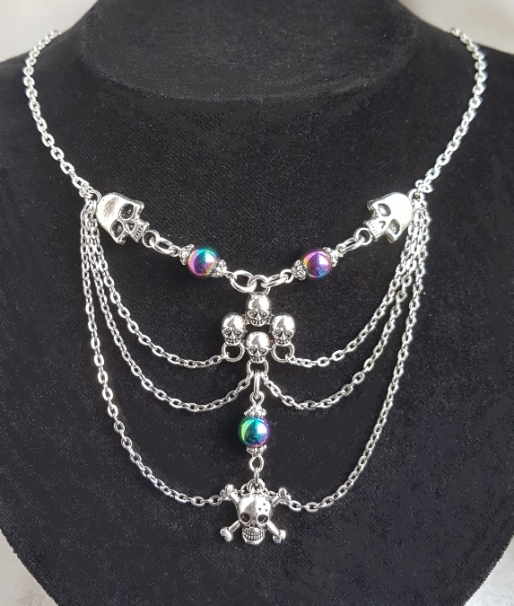 Gorgeously Gothic handmade jewellery. A spooky Skull charm necklace with Rainbow Haematite beads and dangly chains. A creepy-cute gift for your Dark Valentine or stunning Halloween wear.