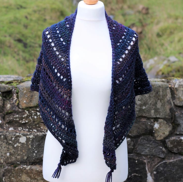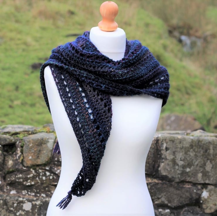 A hand crocheted triangle scarf that is dark blue with multi-coloured highlights running throughout.