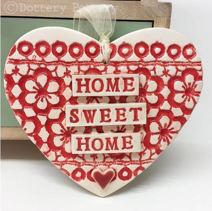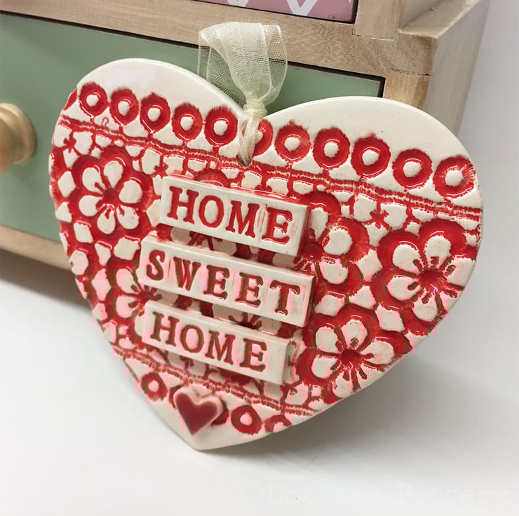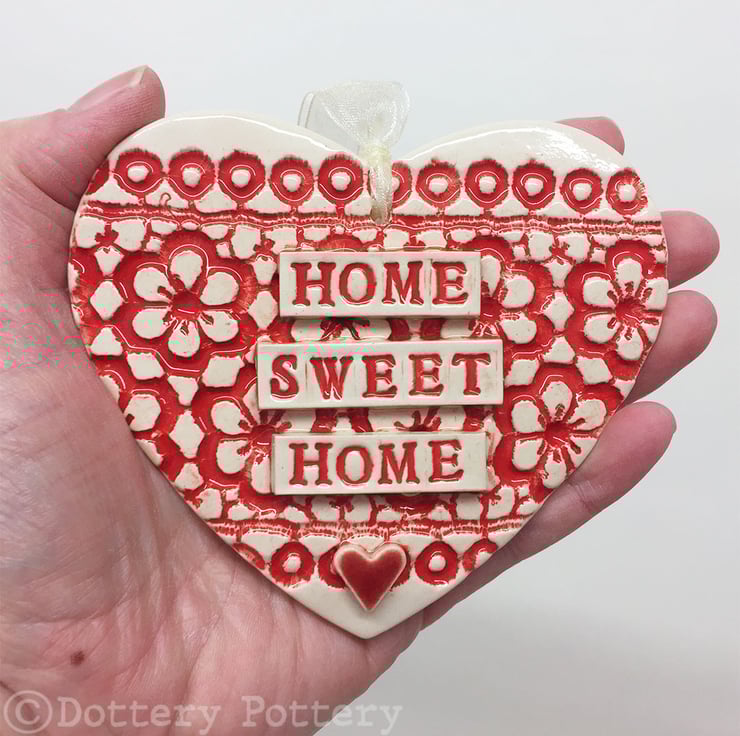 This ceramic heart is made from white earthenware clay, imprinted with pattern and colour and finished with a clear, glossy glaze. It has been fired twice, once to the bisque stage and then a second firing for the glaze. 10 centimetres and the same in height, 5mm thick.