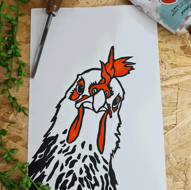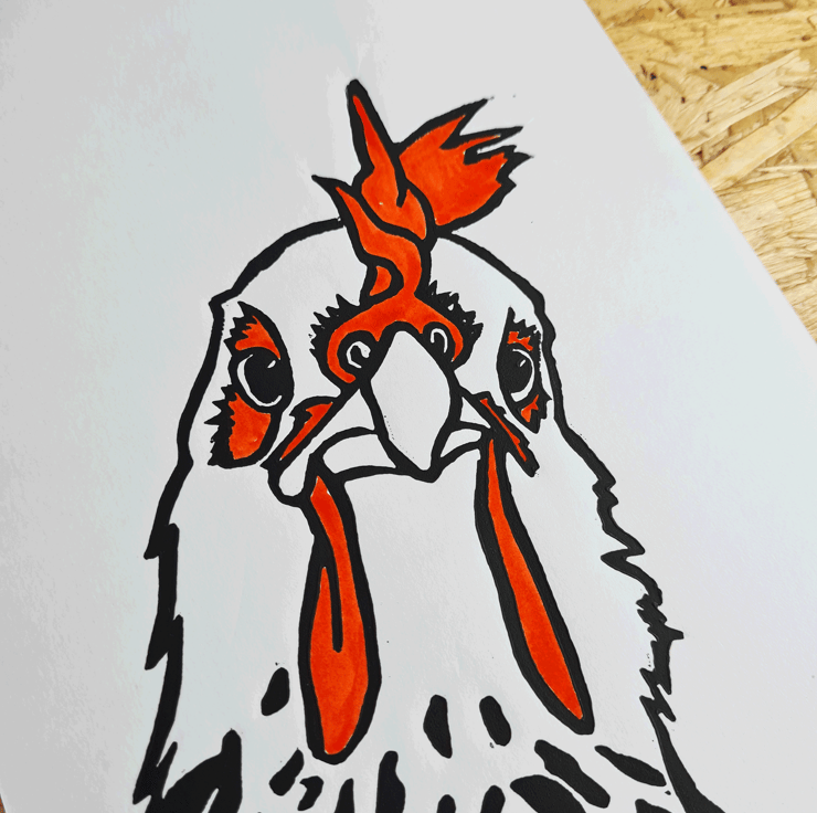 I made the print by sketching the Chicken and once I was happy with the design I transferred the it to traditional Linoleum block before carving around the areas I want to print. I then inked the block with oil based ink and printed on to paper. Each print takes many hours to complete.