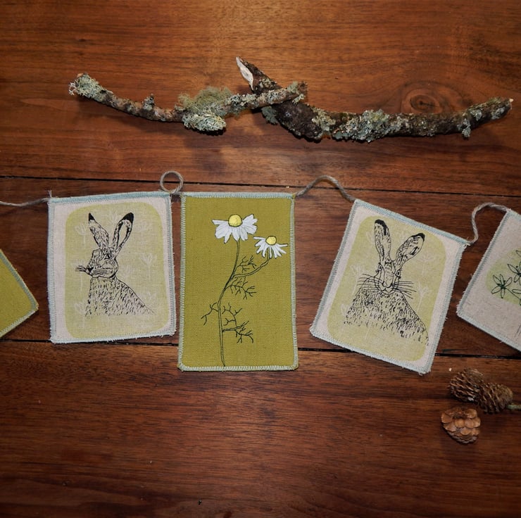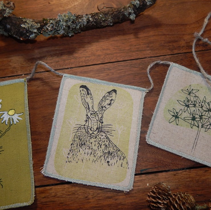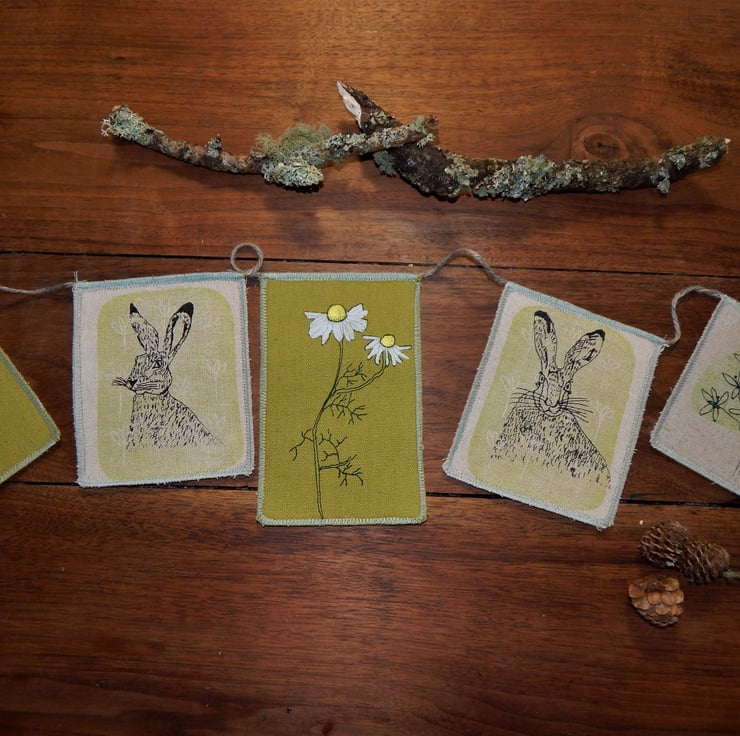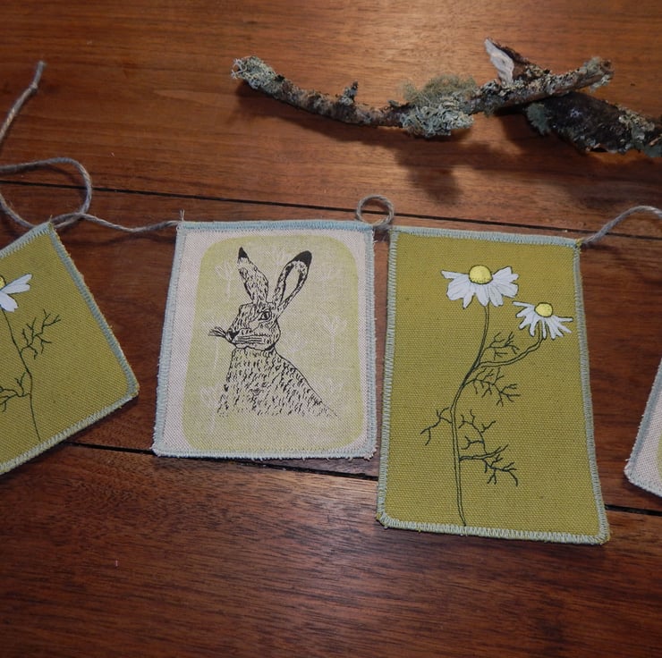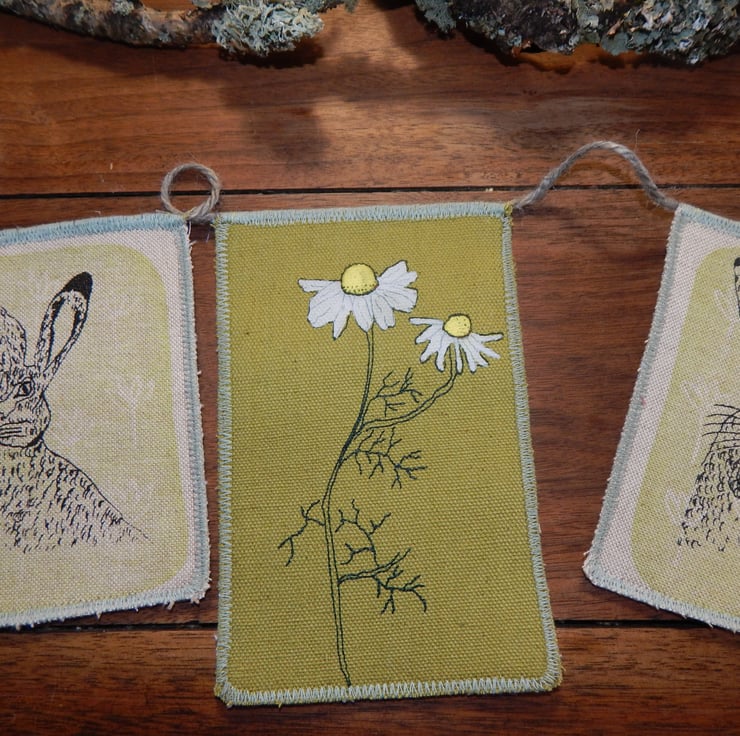 This is a wall hanging that I have made with 2 different Hares screen printed with a green lino print behind them. I have also screen printed a wild garlic with some green lino colour behind. There are 2 daisy designs on green cotton canvas, these have been hand painted on the petals to make them pop with colour. Each rectangle is backed with a plain pink or blue patterned cotton and has one layer of interfacing for some stability.