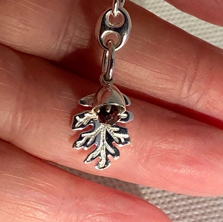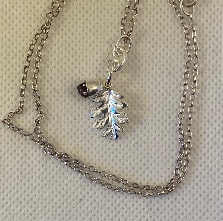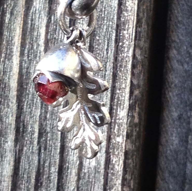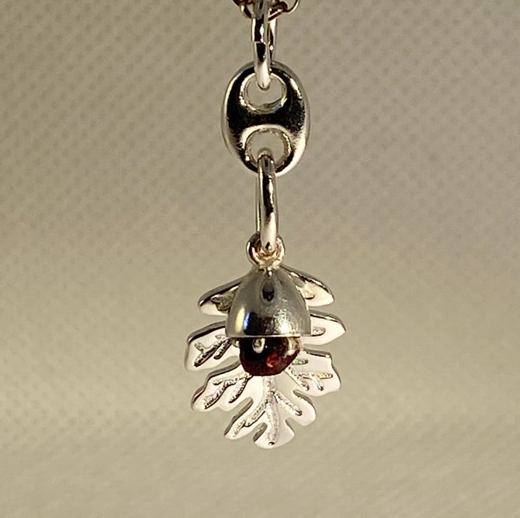 Sterling silver acorn cup and oak leaf with a Thames garnet starring as the acorn. The pendant hangs on a sterling silver Belcher chain (choose your preferred length via Options). The pendant measures 30mm from the top of the bale ring. The garnet was collected on the Thames foreshore. Each raw Thames garnet is different so yours may not look exactly like the one shown but will be of a good similar size and shape.