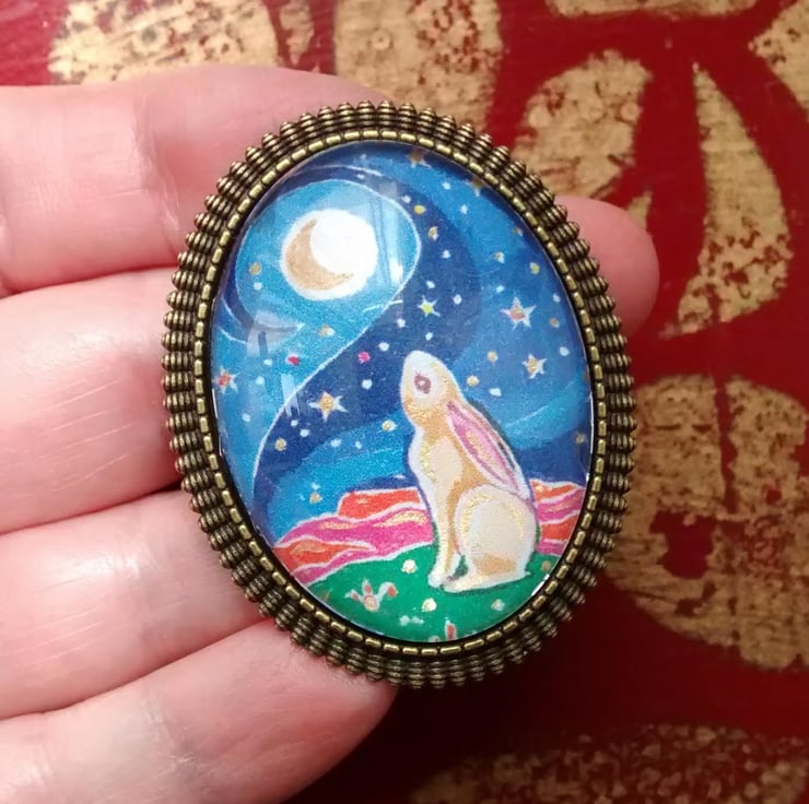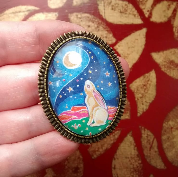 A beautiful picture brooch, with a miniature illustration of the moongazing hare of myth and legend. This little reproduction of one of my miniature paintings has been highlighted in gold then sealed with crystal resin and mounted onto a domed glass cabochon. This has then been firmly attached to an attractive bronze effect brooch. Unique to The Owl and the Pussycat Gift Shop, this pretty brooch would make a special gift for a woman for Mothers' Day, a Birthday, Valentine's Day or many other special occasions.