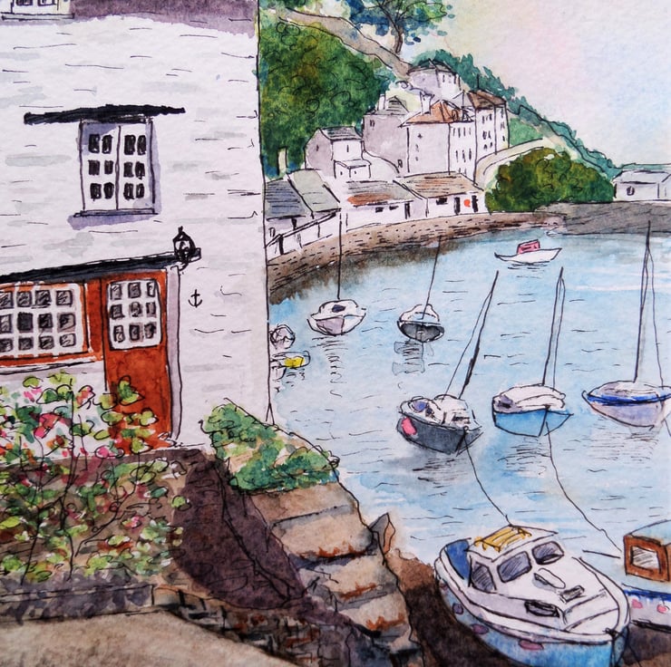 My original watercolour pen and wash painting of The Warren in the charming fishing village of Polperro. Based on my own photographs, the view is of "The Old Watch House" cottage and beyond towards the harbour. Watercolour washes have been applied over an ink pen sketch.