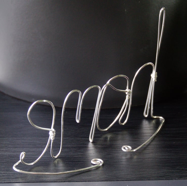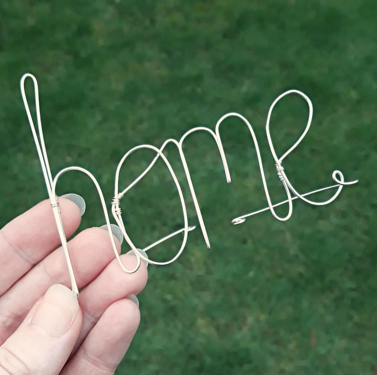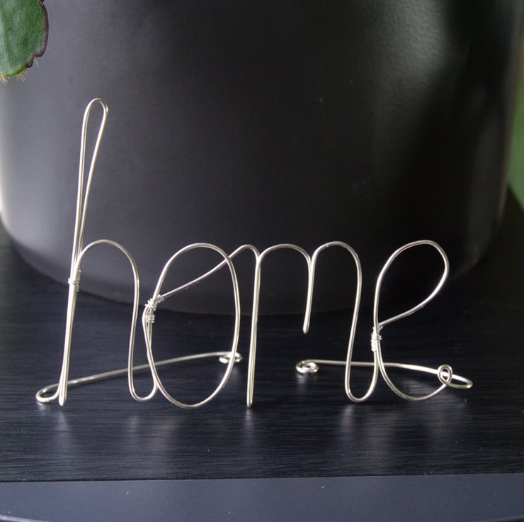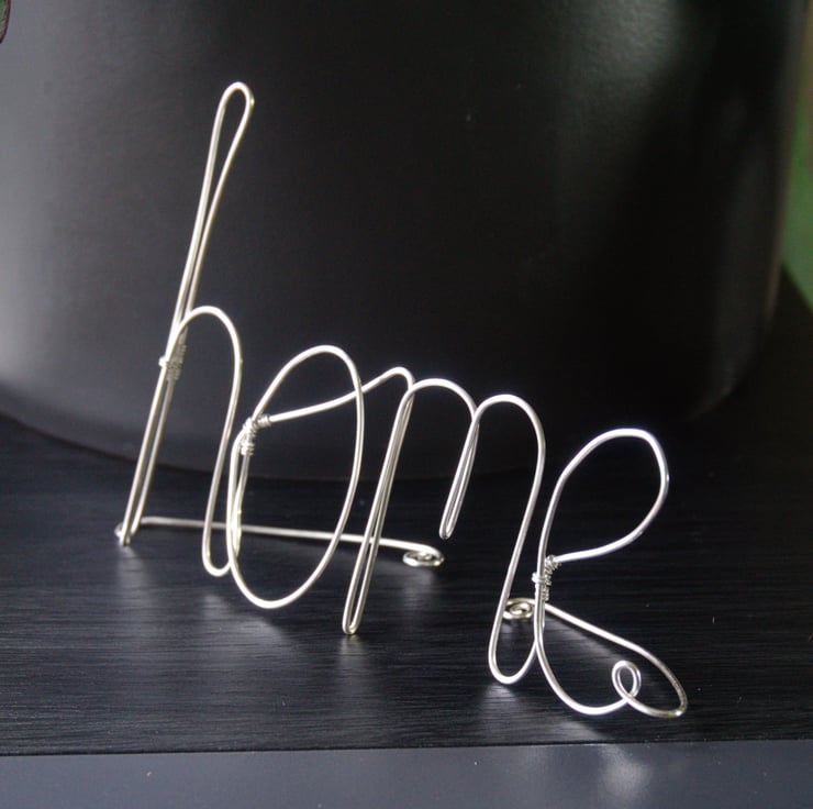 Show your love for your home. This lovely decoration is made from 1mm thick silver plated copper wire. I've formed the word 'home', leaving two tails which curve behind to stand it up. It would make a really lovely addition to a shelf or bookcase, or a fab housewarming present!