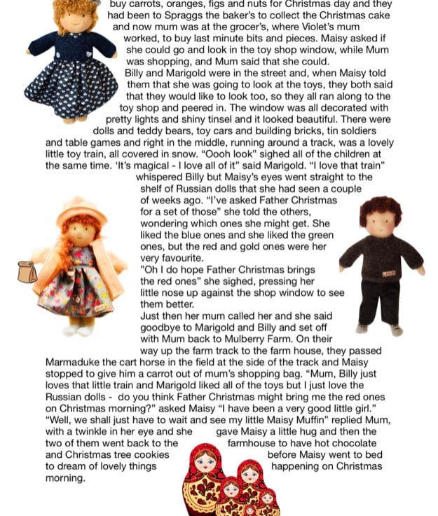 There are other children in Maisy’s class at school - Violet, Billy with his pet rabbit, Amber, Tilly, Rosie and her kittens, Amelia, Ruby, Marigold, Bobby with Max the dog, and the twins Oliver and Olivia, who have a puppy called Oscar. The dolls are all 26cm tall and baby Daisy is 16cm. Maisy and Mo love nothing more than having adventures with their friends. You can read about their adventures on my Facebook and Instagram pages - Maisy Muffin Rag Dolls and on my Mulberry Green Pinterest boards.