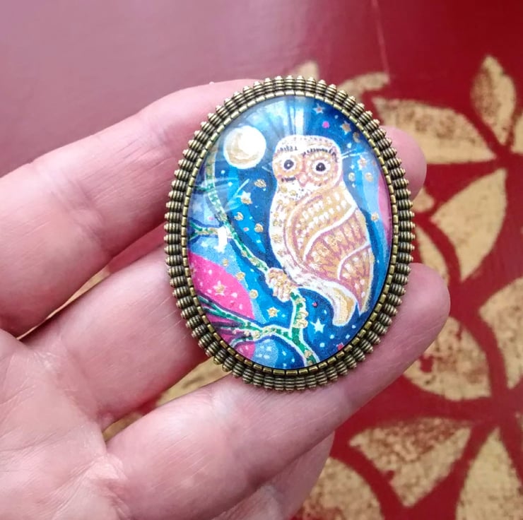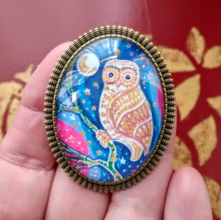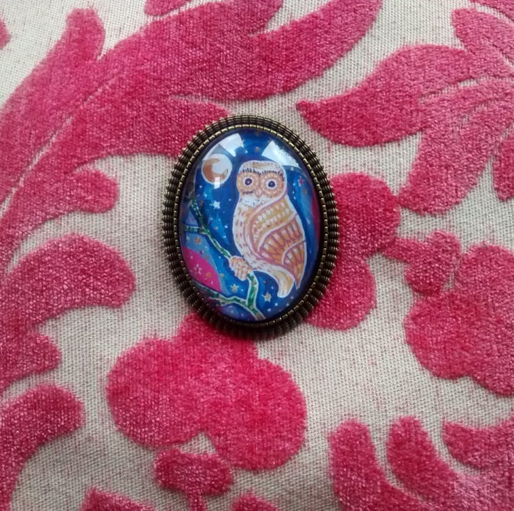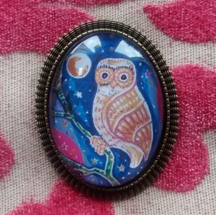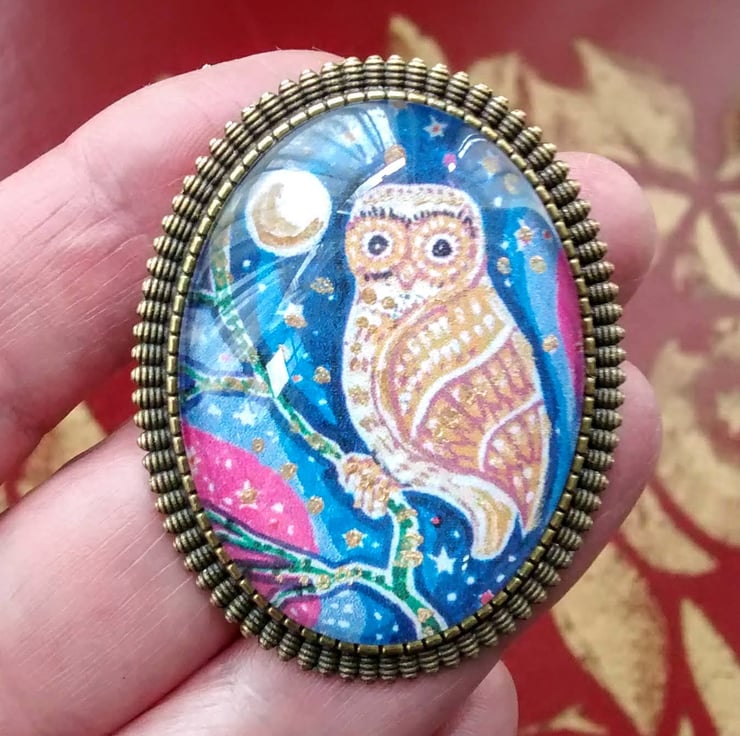 Was £14.00, now £10.00. Inspired by a tiny model of the Owl of Athena, I have created this brooch by painting a miniature picture of an owl perched in a tree beneath the moon. I have highlighted the picture with touches of gold paint and sealed it with crystal resin behind a domed glass cabochon and set it in a brooch of antique bronze effect metal.