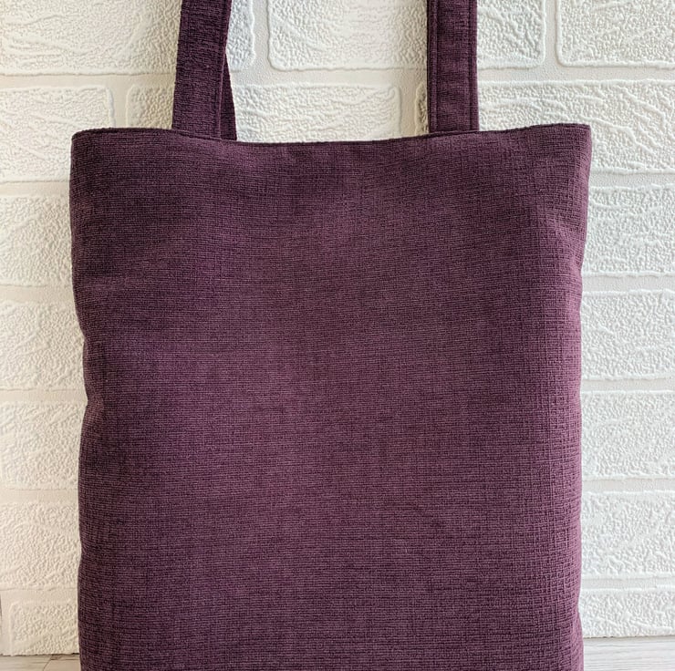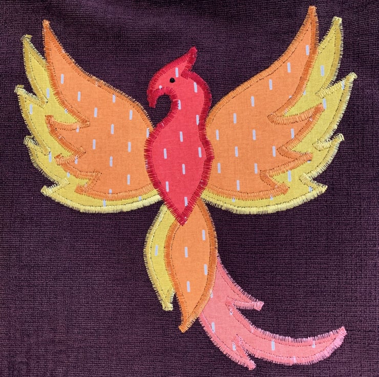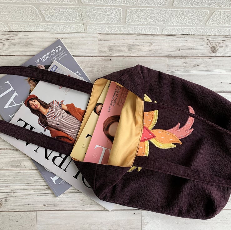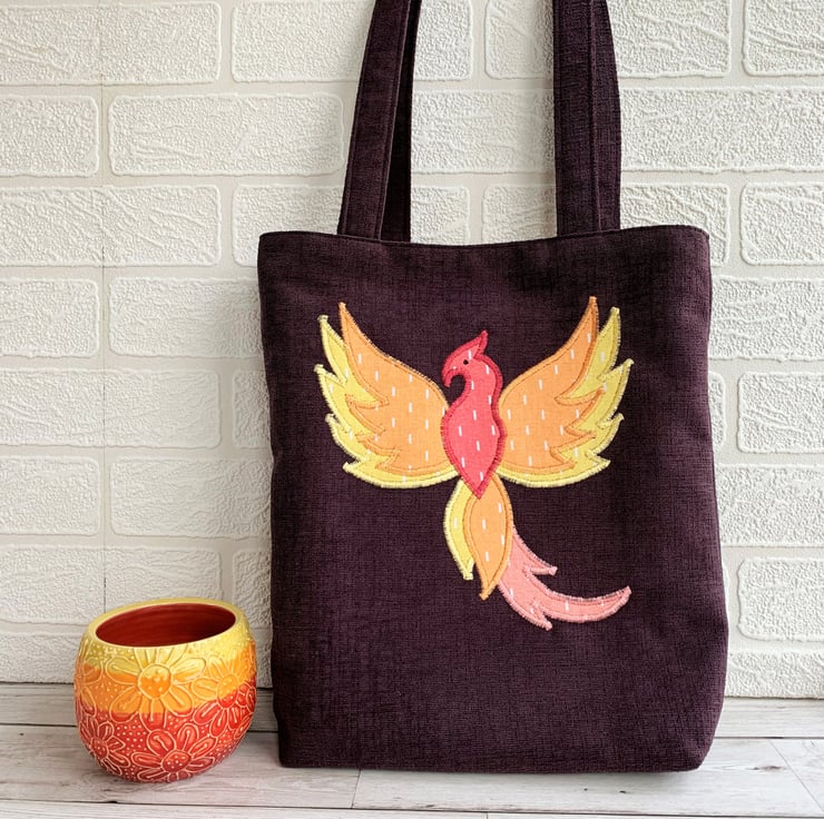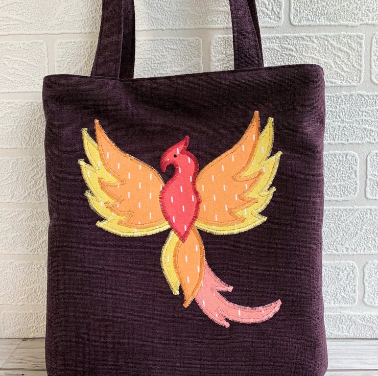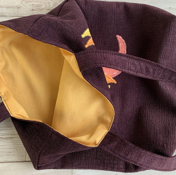 A tote bag in a lovely textured dark plum purple fabric with an appliqué design depicting a mythical Phoenix bird. The Phoenix is made from matching fabrics in coral pink, peach, yellow and salmon pink, all with a pattern of white dashes. I’ve added a small black sequin eye. The bag is lined with a lovely contrasting golden yellow fabric.