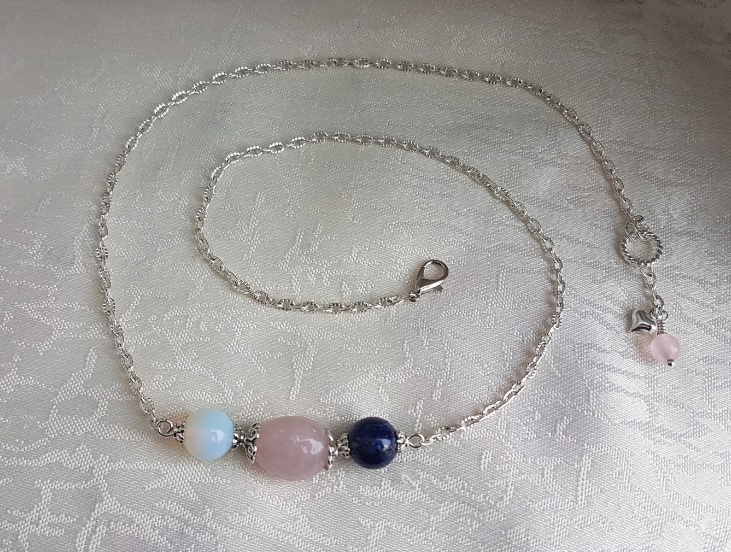 Lapis Lazuli is known as the stone of wisdom and truth and great for enhancing communication. Rose Quartz is said to represent unconditional love, inner healing and promotes peace.