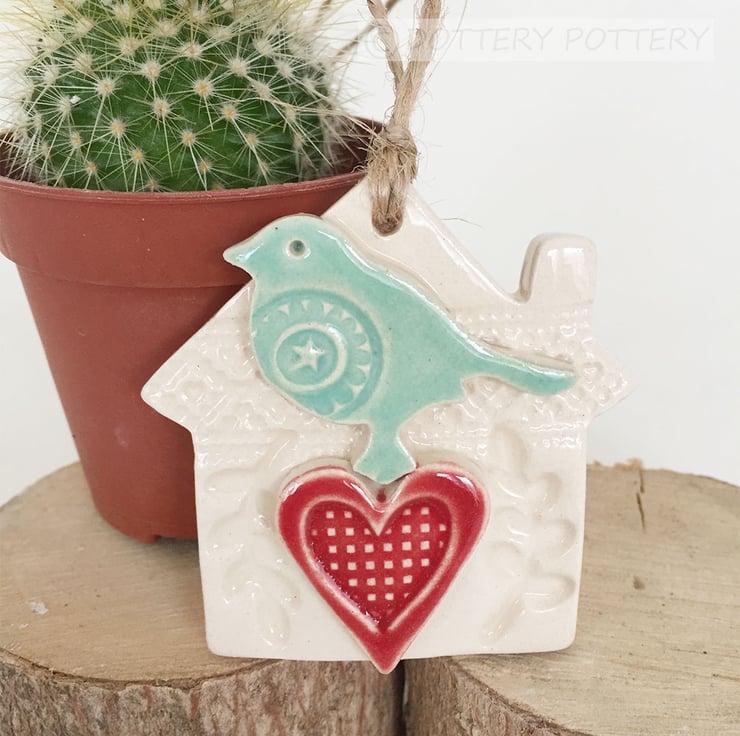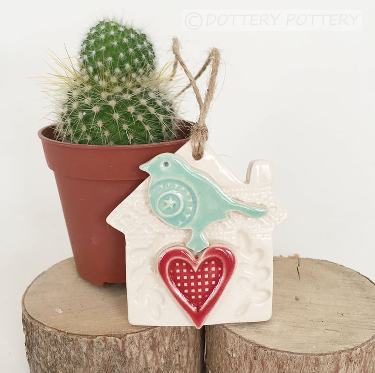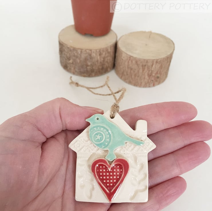 This little bird house decoration is made from white earthenware clay and finshed with a cute love heart and a bright bird. It has been fired twice and finished with a glossy glaze for a lovely smooth finish. It measures 7.5 x 7cm and hangs from rustic brown string