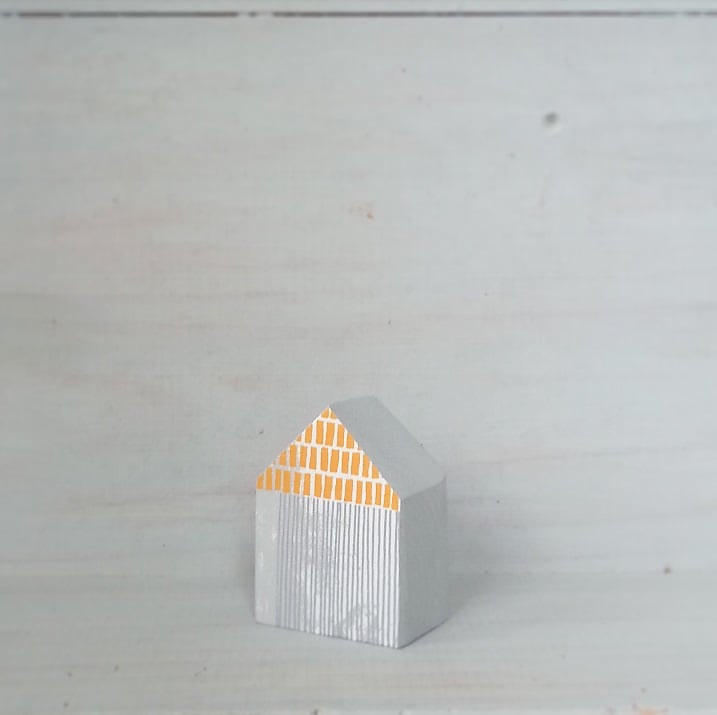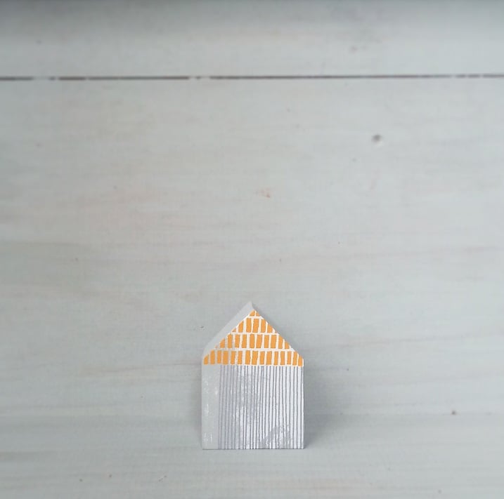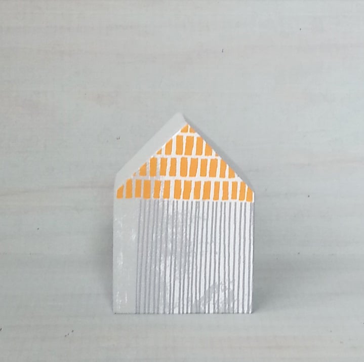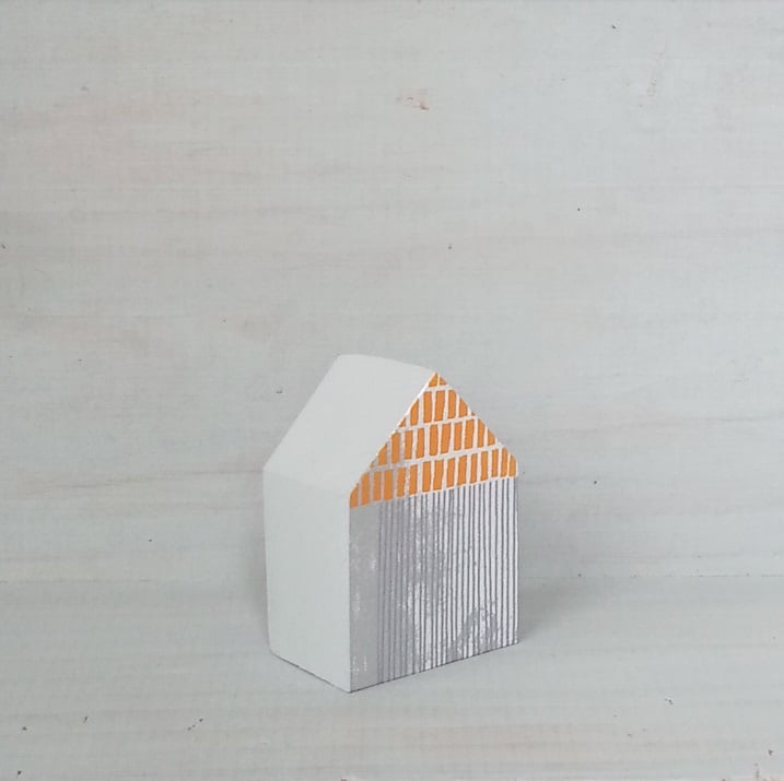 This one of a kind little wooden house is made from reclaimed wood, painted grey, and screen-printed by hand in layers of white, orange and slate grey. The back of the house is blank.