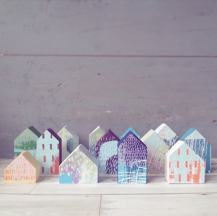 I moved to the countryside in 2019 and had been building up a stash of wood offcuts from other projects, intending to use them for firewood for the coming winter; realising that a lot of this wood was high quality pine which was too good to burn, I came up with the idea of using it to make little houses (a shape which is relatively easy to cut with limited woodworking skills/equipment). As it turns out, little houses are not only en vogue but they are the perfect canvas for experimenting with colour and pattern!