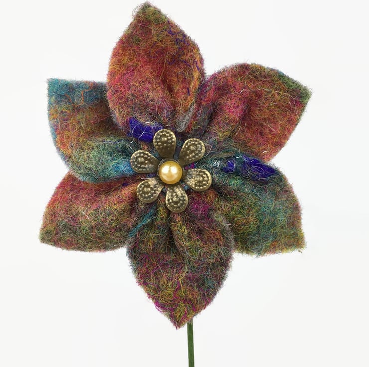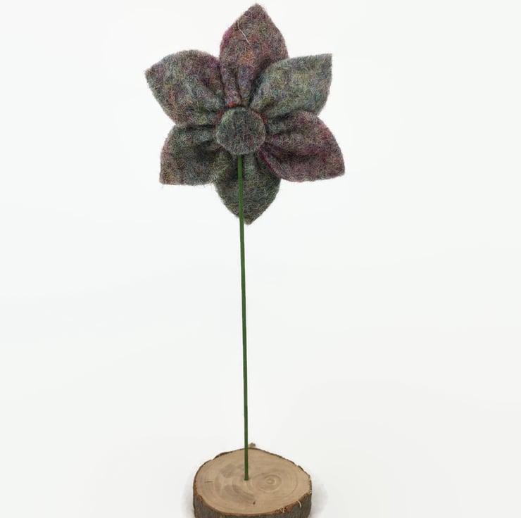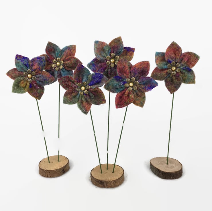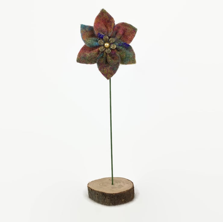 A pretty, multicoloured felt flower with a wire stem has been mounted in a small rustic wooden slice to create a beautiful floral decoration. The flower has been made from a piece of hand made multicoloured felt which has been embellished with silk and angelina fibres. The felt has been cut and stitched into a flower shape and a stiff green florist wire stem attached. An antique bronze effect petal shape with a golden yellow half pearl added to the centre forms the centre of the flower. The flower measures approximately 6cm (2.4") in diameter and the height of the decoration is approximately 18cm (7"). The flower can be easily removed from the base and placed in a small vase if required. The stem can also be easily cut and bent as required.