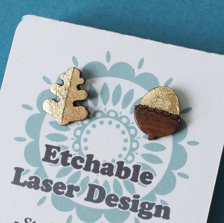 Teeny tiny solid walnut acorn and solid oak leaf stud earrings with gold leaf detail, which catches the light as you move.