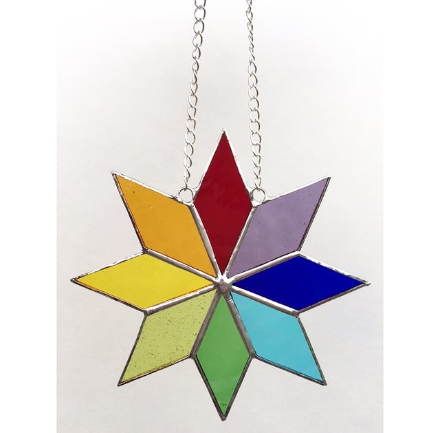A pretty handmade stained glass star suncatcher I have made using the tiffany copper foiling technique using different shades of stained glass and finished with a chain. The colours of the glass are beautifully shown when hanging in a window catching the light or hung as a decoration.