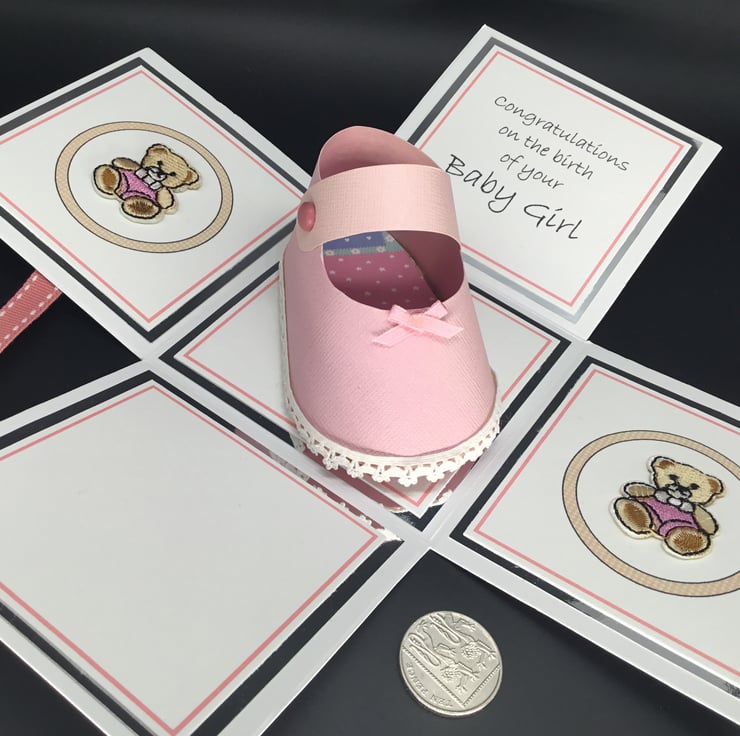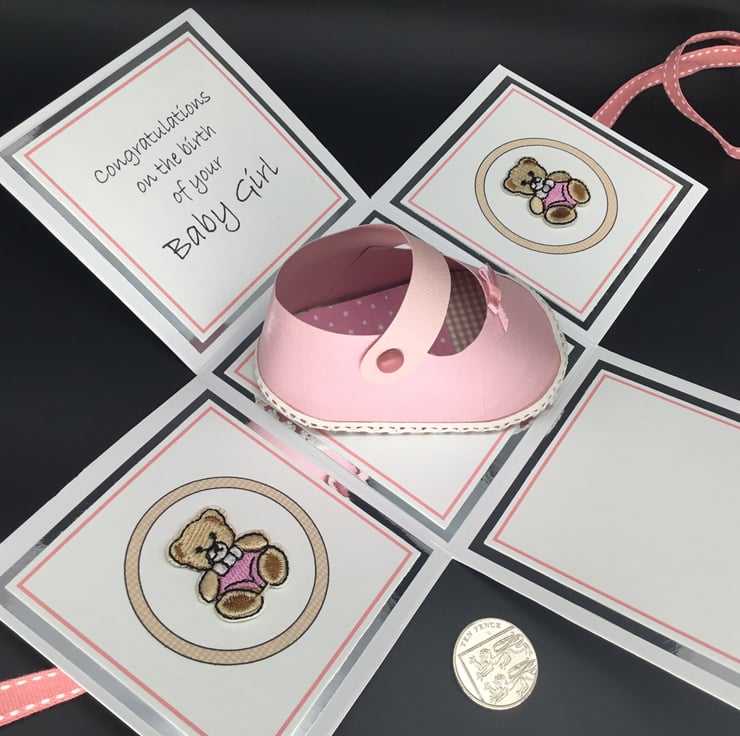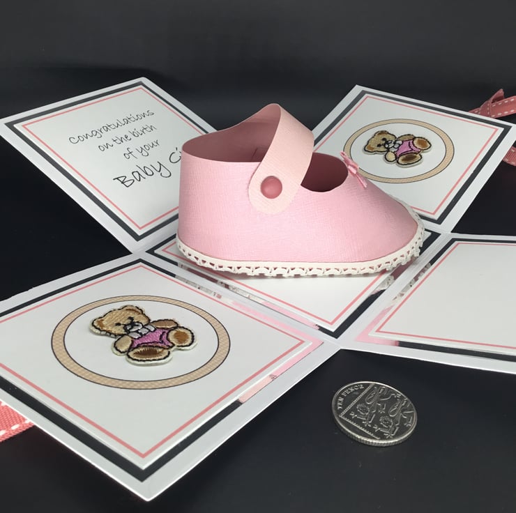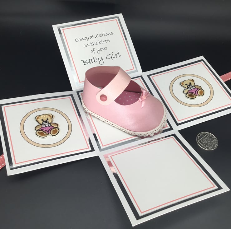 The shoe has been made using quality textured, pearlescent pink card stock and co-ordinating embroidered teddy bear embellishments have been used to decorate two panels of the exploding box. The sentiment reads ‘Congratulations on the birth of your Baby Girl’’ and the fourth panel has been left blank for you to add your own personal message.