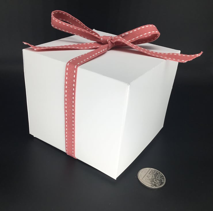A co-ordinating ribbon is used to secure the exploding box when folded up, which measures approximately 10.5 cm x 10.5 cm and is approximately 9.5 cm tall.