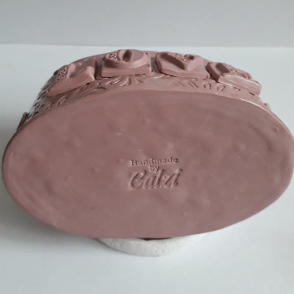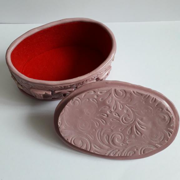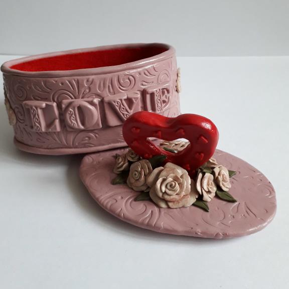 I have used antique rose polymer clay for this oval box, the surface has been textured with a swirly pattern, I have added clay letter tiles to spell "Love" on each side and two ivory hearts to each end.