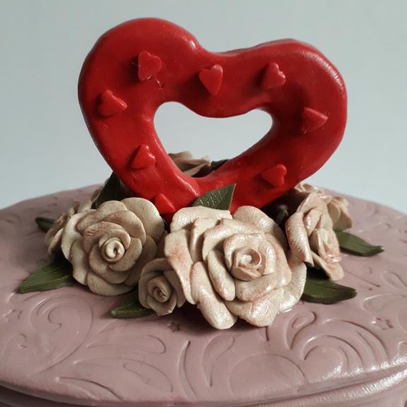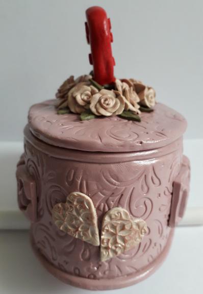 The lid has a red heart handle with ivory roses around it, I have brushed red metallic powder over parts of the roses and the ivory hearts.