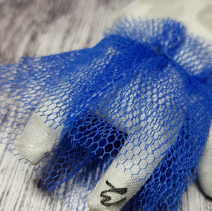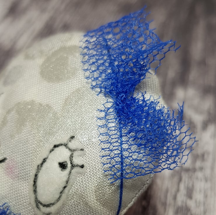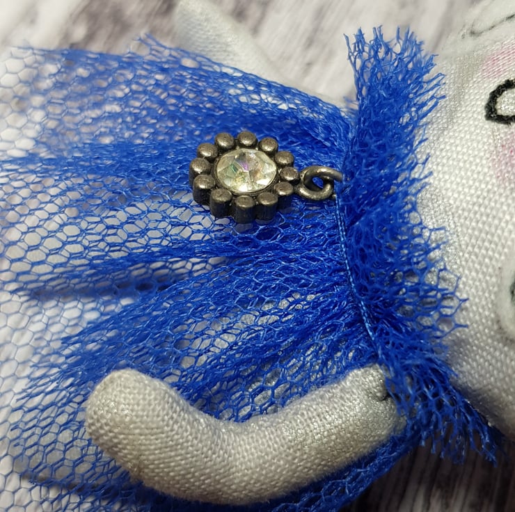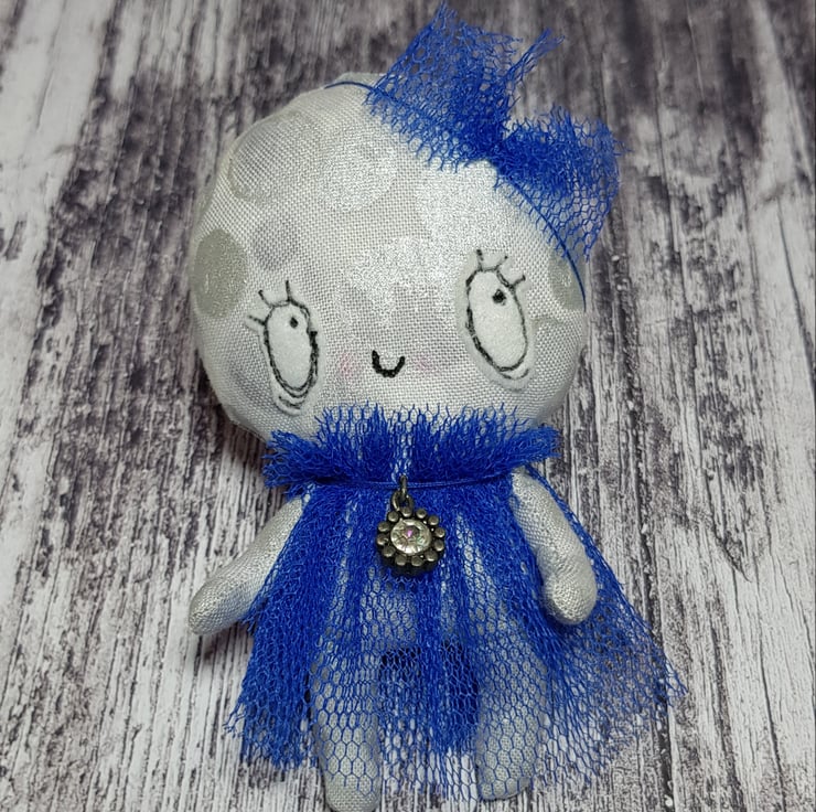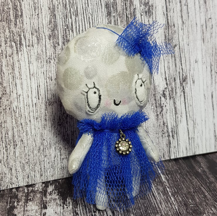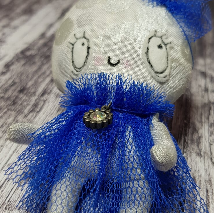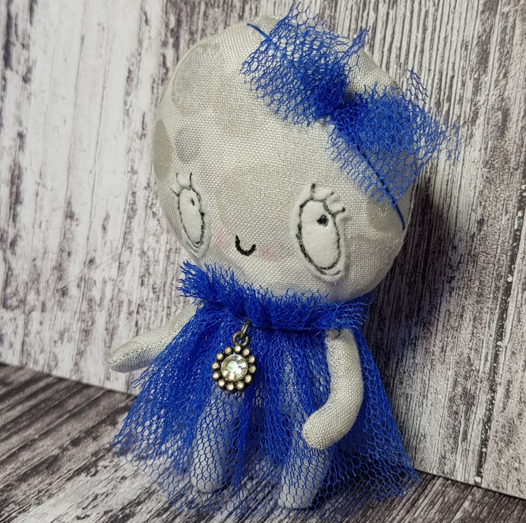 This whimsical art doll is made with a metallic cotton that shimmers and catches the light beautifully. She wears a head piece made from blue tulle and her dress is hand sewn, layered with a ruffle neck. She has the Wubsys 'W' hand embroidered to the back of her foot. Her face is free motion embroidered with felt and she has waxed rosy cheeks.