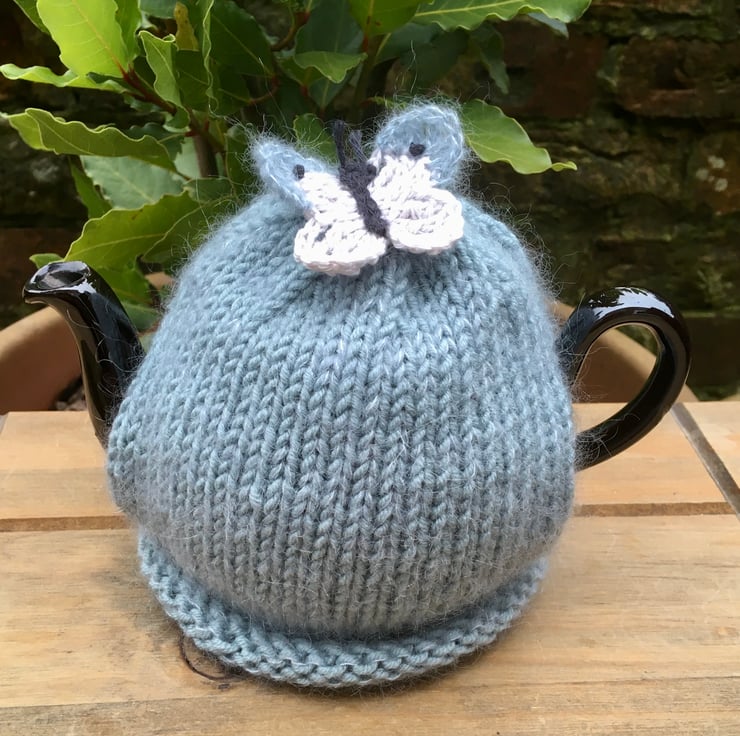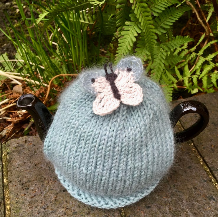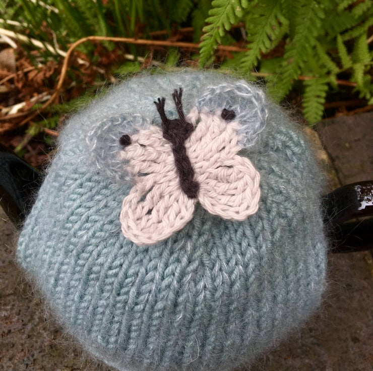A pretty crochet butterfly sits daintily on top of this small luxury mohair tea cosy.