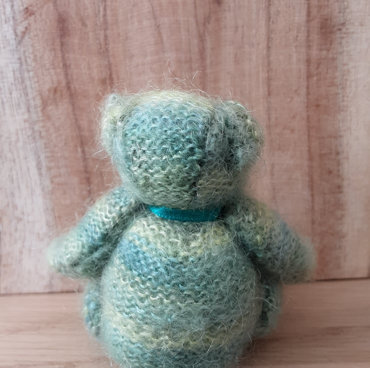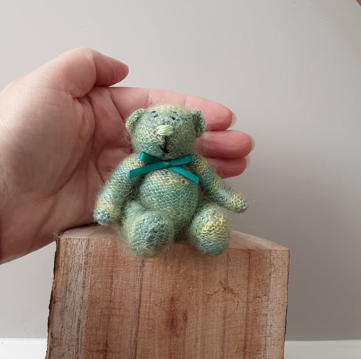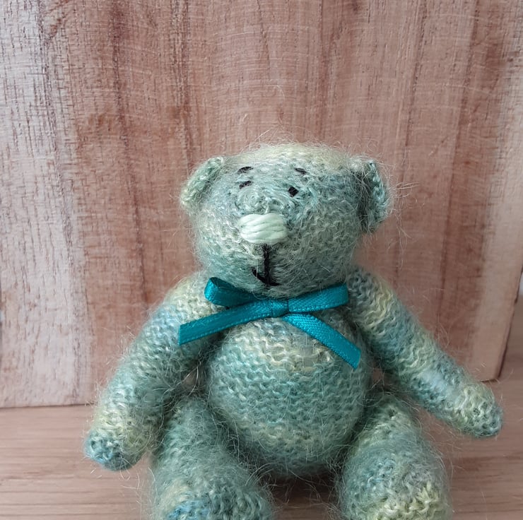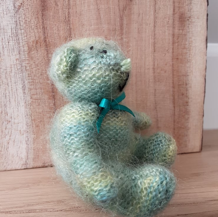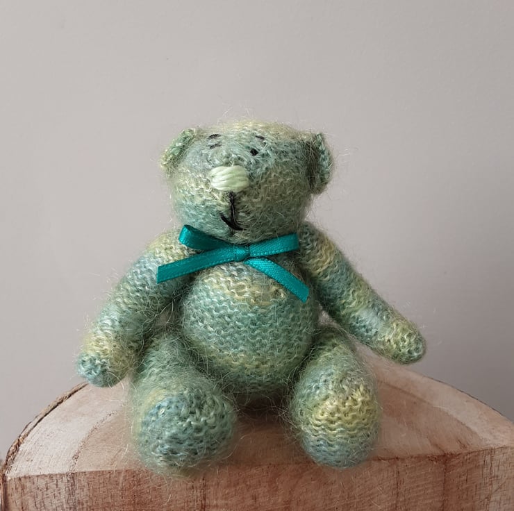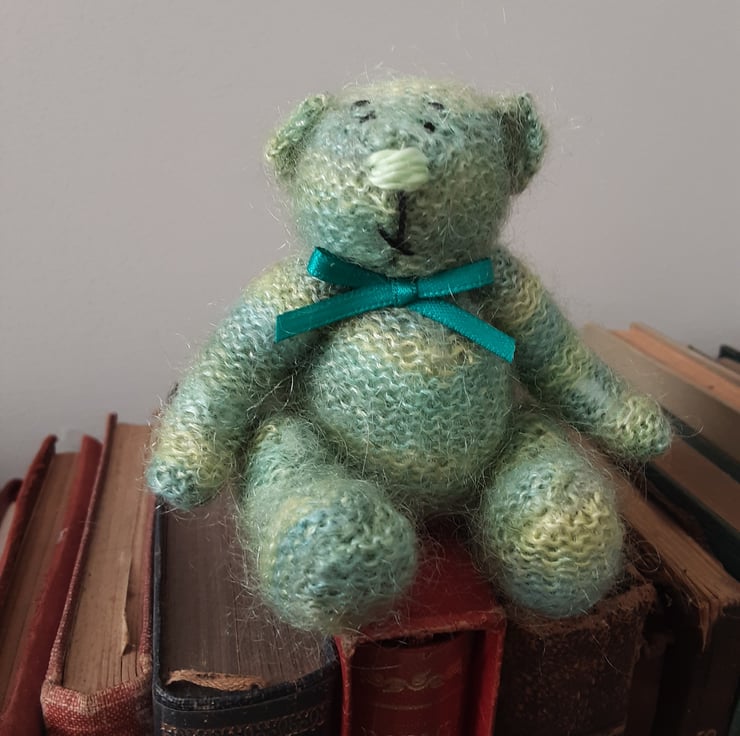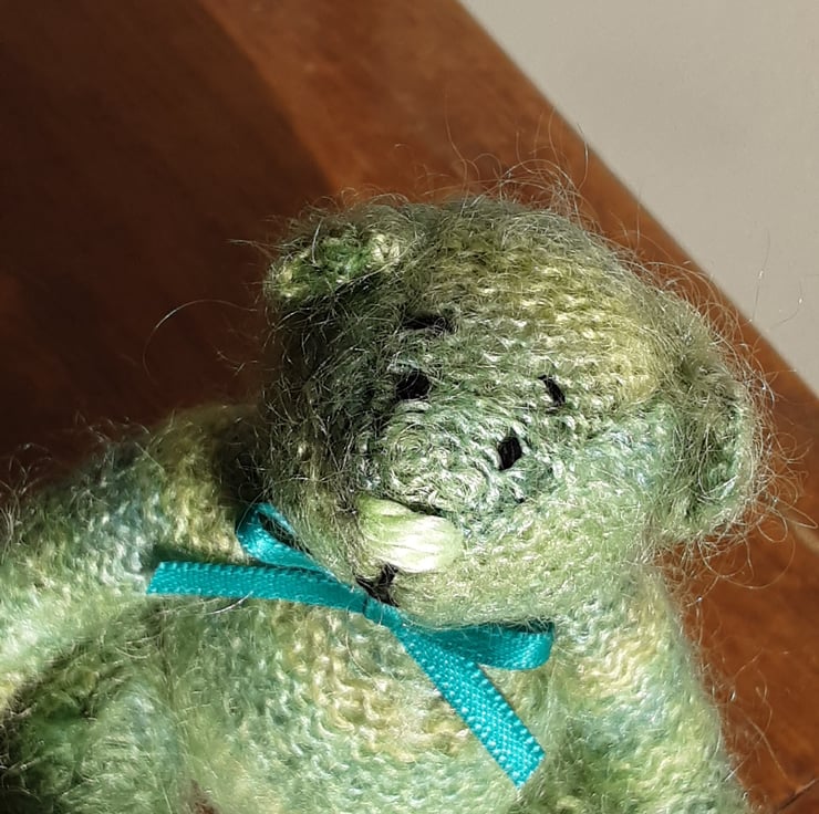 Fell in love with the mohair lace yarn which is also hand dyed. I always choose the colour for the nose only when I've knitted the bear and this little one looked right with a nose in the same green tones.