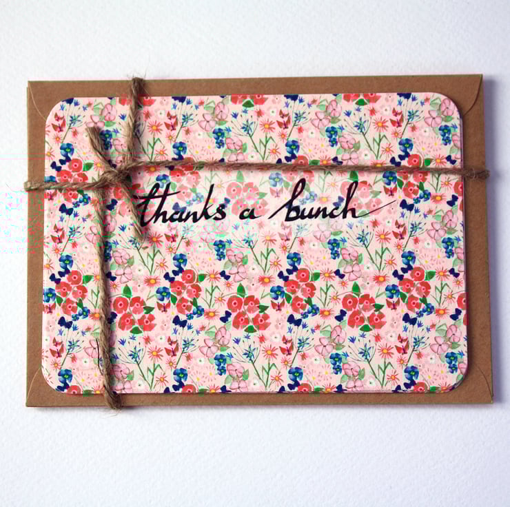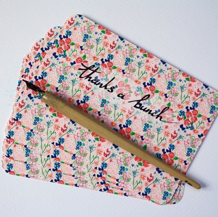 Set of four pretty patterned notelets, featuring my watercolour floral butterfly pattern and calligraphy 'thanks a bunch'