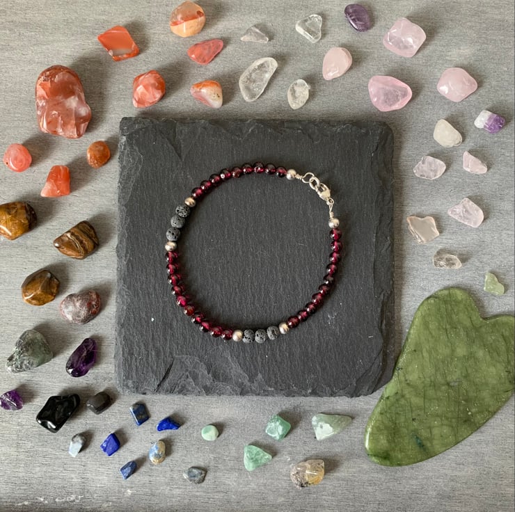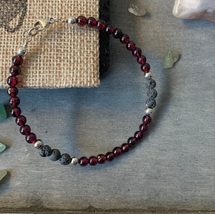 Garnet beads in a rich polished red, alongside 4mm Sterling Silver beads. The Volcanic Lava stones are unwaxed and porous, readily absorbing your choice of essential oils to ensure that your aromatherapy can be used over several hours. Useful during those stressful times.