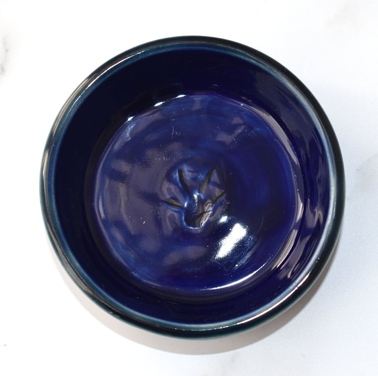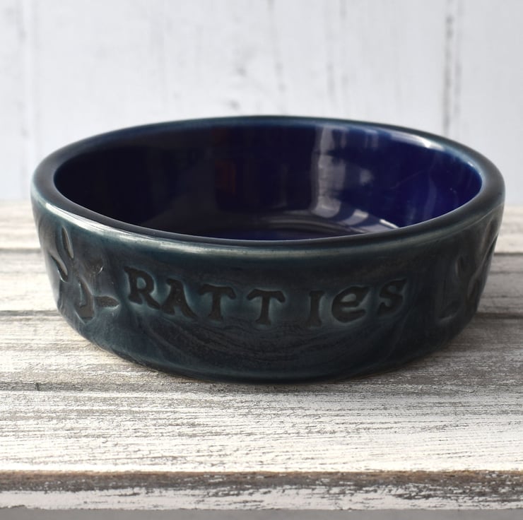 Wheel thrown handmade pottery pet rat bowl with 'RATTIES' on the outside and a pawprint in the middle. The outside is glazed in a smokey blue colour with the inside in an intense cobalt blue.