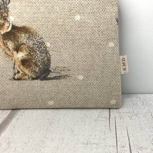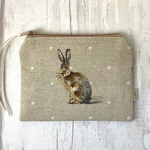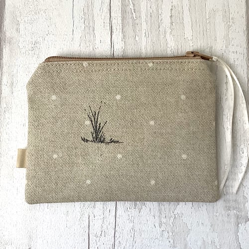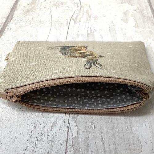 Coin purse with a print on canvas fabric. Lined in black spot cotton with a zip fastener. 11.5cm wide by 9.5cm high.