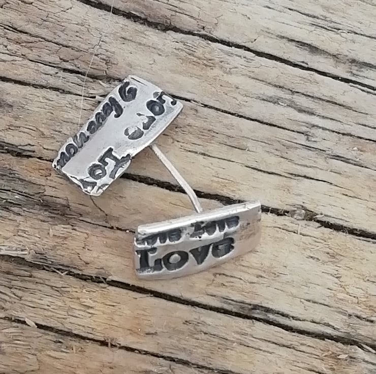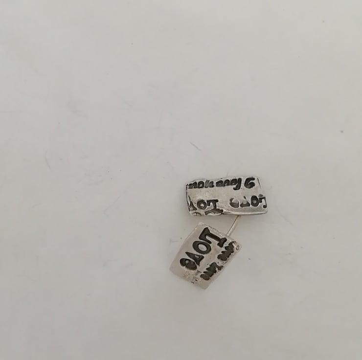 Sterling Stud earrings with rectangular shape surface and love in different scripts.