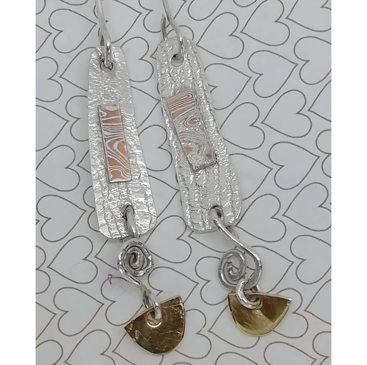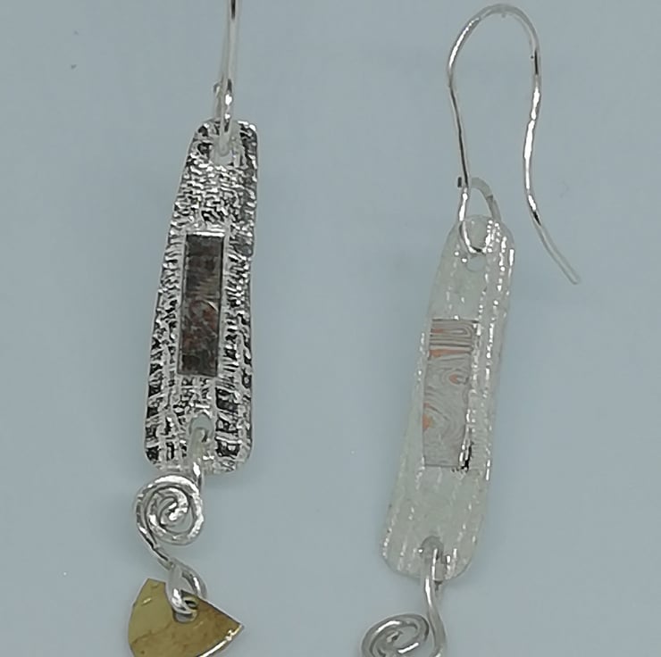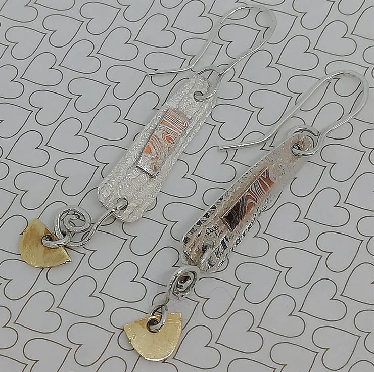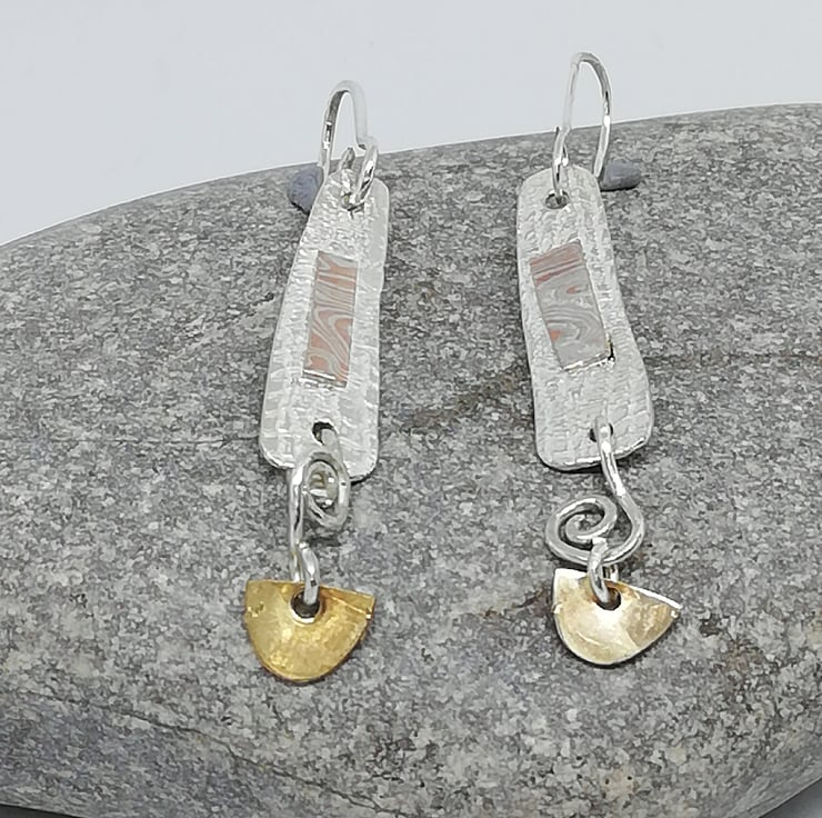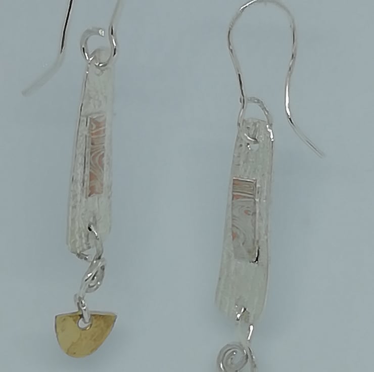 An unusual style of earring made from sterling silver and 14ct gold decorated with Mokumo Game plaques and coils. The earrings are articulated to give movement and add interest.
