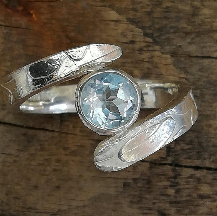 Stunning crossover engagement ring with aquamarine stone available in silver, white gold or yellow gold with 'stone wall' textured band. The design was inspired by a student workshop where the stone Wall effect was used. I liked it so much I used it in a bespoke design. I just love the cross over effect in the ring.