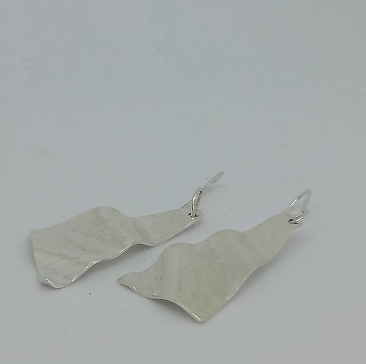 Sterling silver drop earrings. Triangular earrings approx 5cms Long x 2cms at the widest point, these earrings have been lightly textured and rippled to give an interesting shape that catches the light emulating the sun shining on the sea.