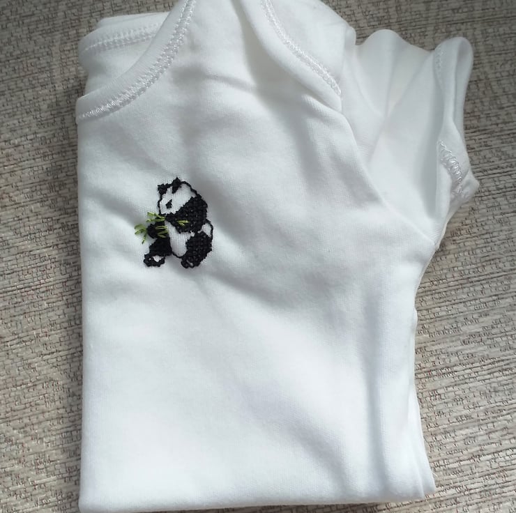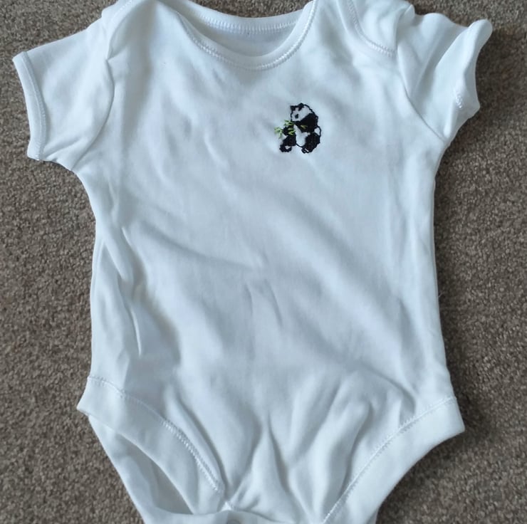 This is a lovely soft white baby vest/onesie by George. I have hand embroidered a panda of my own design on the front. It is sitting muching on a bunch of vivid green bamboo. The vest has an envelope neck, short sleeves and three press studs between the leg openings. It is 100% cotton and can be machine washed.