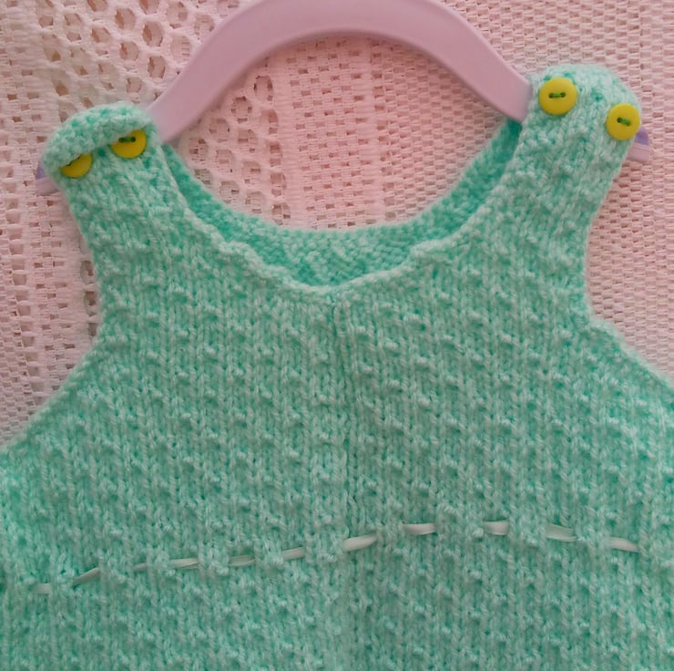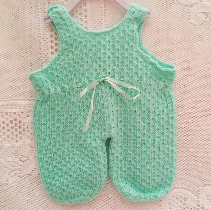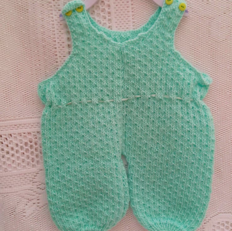 Beautiful baby's dungarees hand knitted in green double knitting weight yarn in sizes from premature to 18 months old. They can be made in a colour of your choice for either a boy or a girl, please state the colour required when you order. Available sizes are shown at the bottom of this listing. The processing time will be 1 - 2 weeks to produce and post to you.