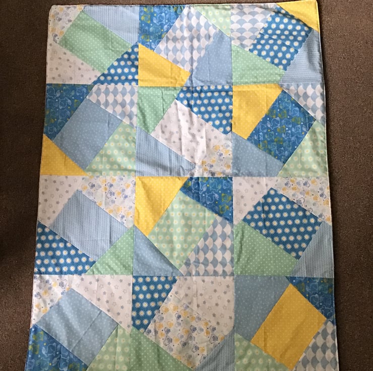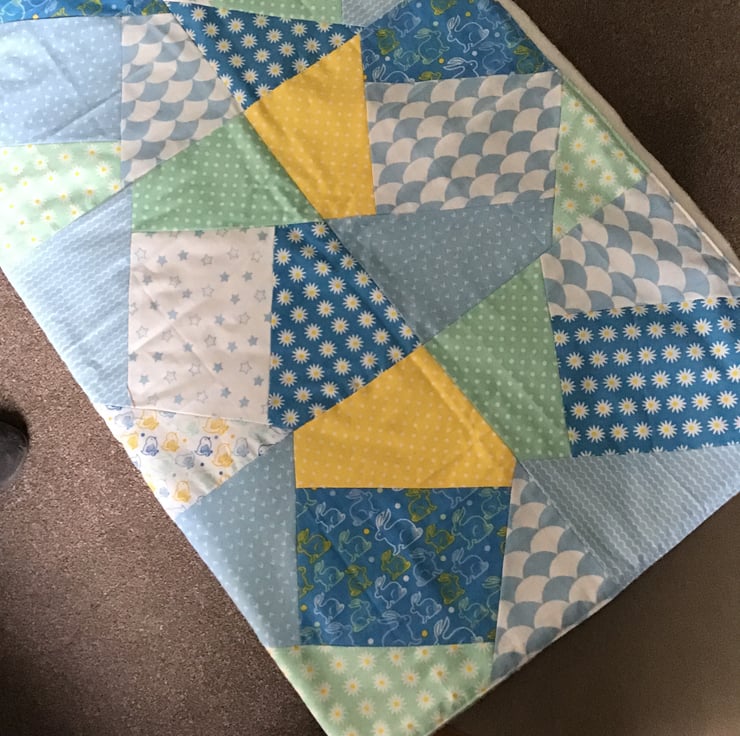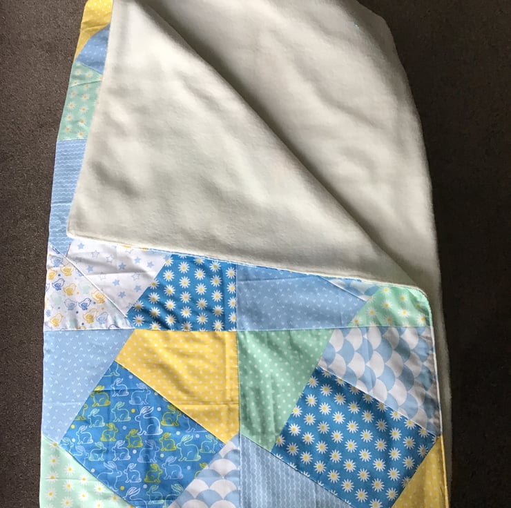 Pretty pastel nursery colours. The patchwork top is cotton and polyester cotton and has a soft and cosy cream fleece backing.