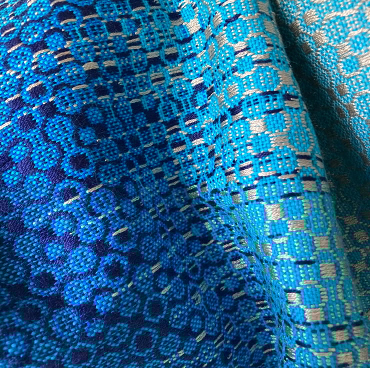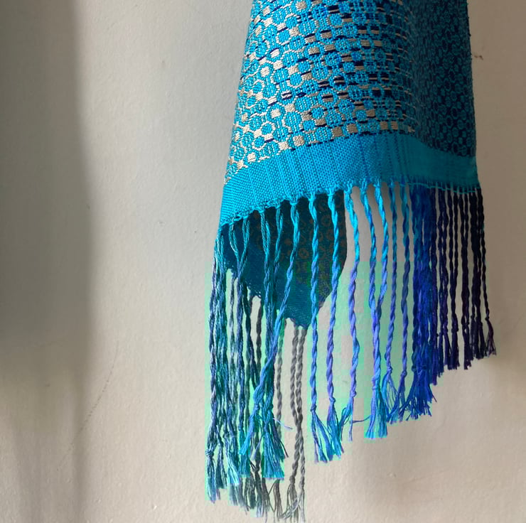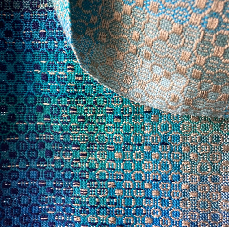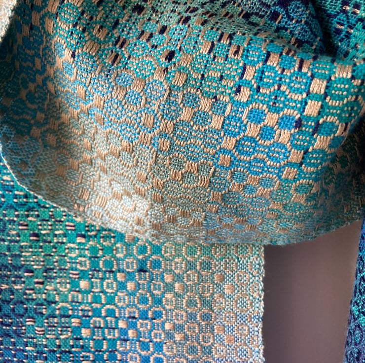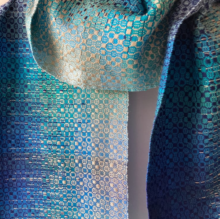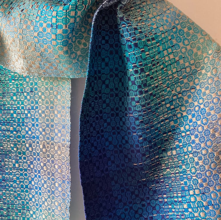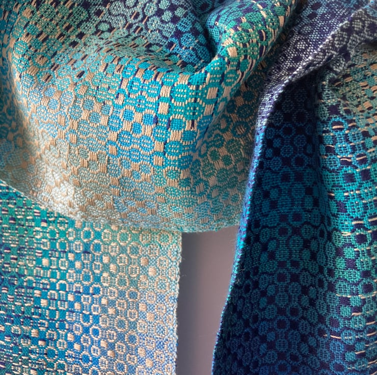 Beautifully soft handwoven scarf in very fine silk and cotton. Handwoven using a Fibonacci graduated warp from navy blue, though teal to turquoise, sea green and ecru. The draft is an old American miniature overshot, forming tiny circles like rain on the sea. I used a clasped weft- weaving two colours on each pick or row, which makes the wrap two tone across its width. This gives a beautiful effect when wound twice around your neck.