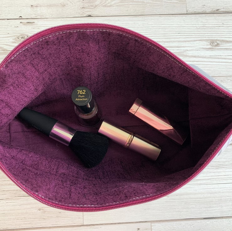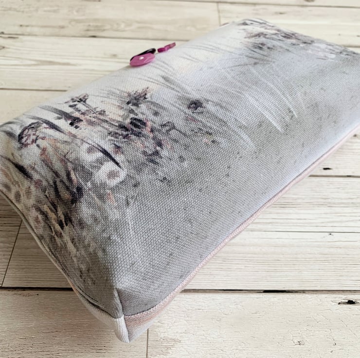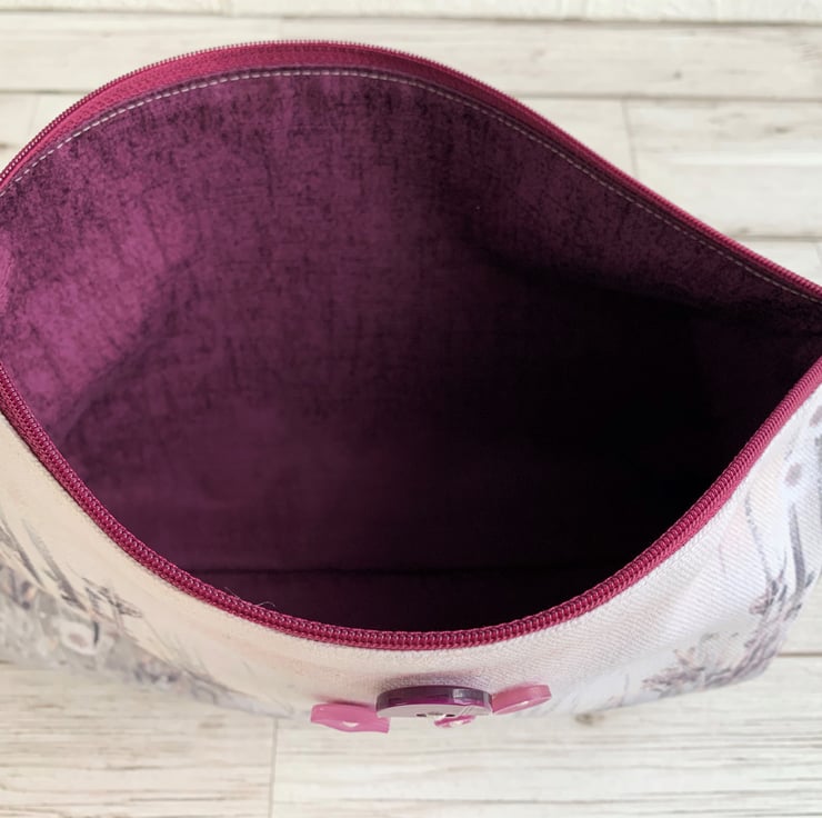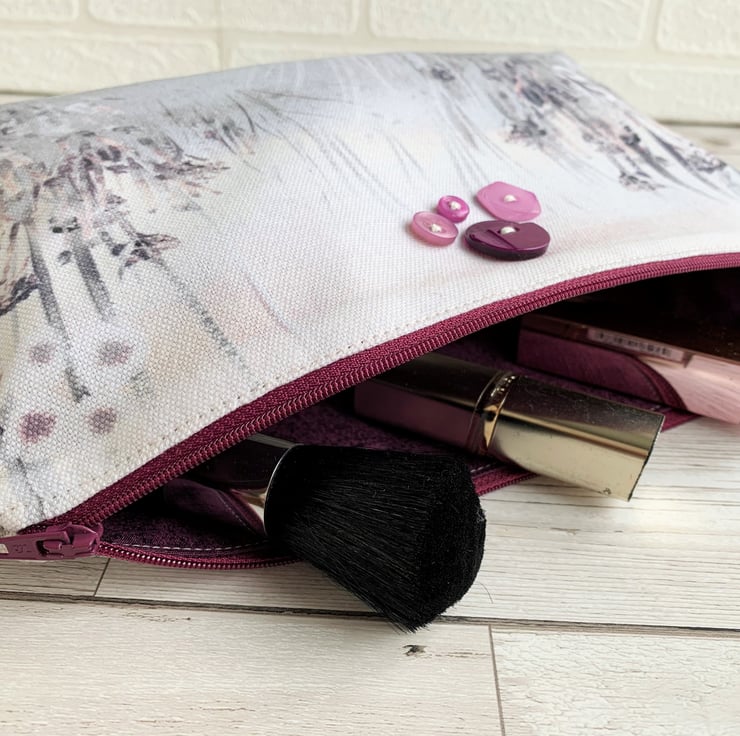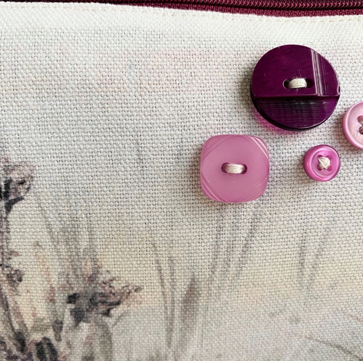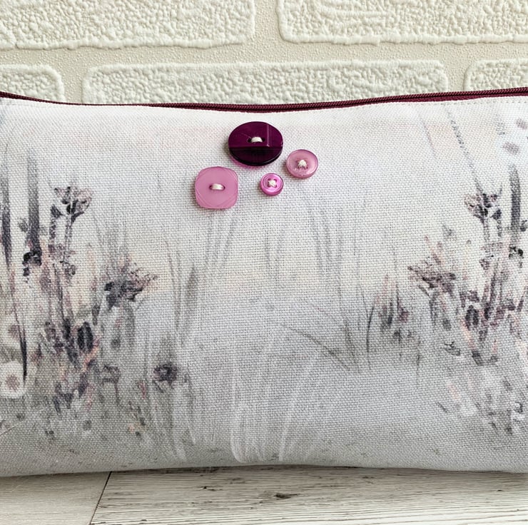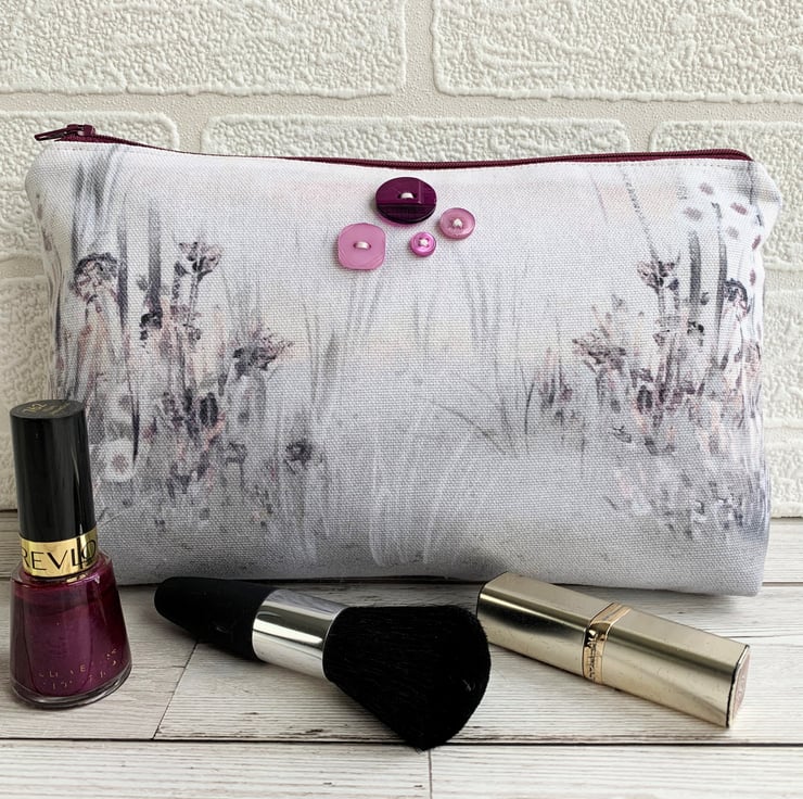 A large sized make up bag in print fabric featuring a delicate coastal scene of flowers, reeds and grasses. The scene is picked out in subtle and delicate shades of grey, pink and purple against a white and pale grey background. I've added a decorative cluster of four different sized buttons in shades of purple, lilac and dusky pink. The cosmetic bag fastens with a matching plum purple zip and is lined with plum purple fabric with a mottled sheen. The base of the bag is boxed giving lots of space inside.