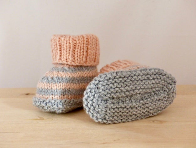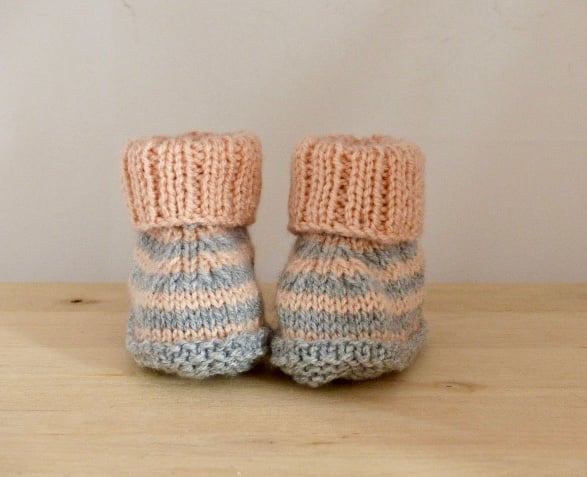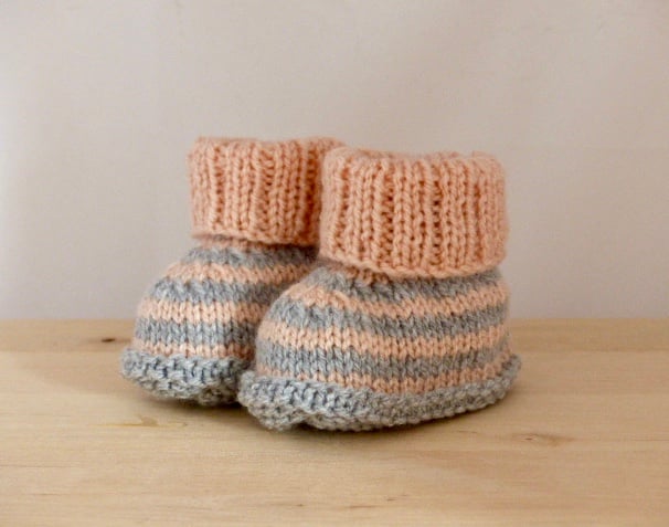 A pair of hand knitted booties in soft peach and grey 100% acrylic yarns. The sole of the booties are plain grey, the foot is striped and the turn down cuff is knitted in rib in peach. They measures approximately 4" from heel to toe and have plenty of stretch. An ideal gift for any baby.