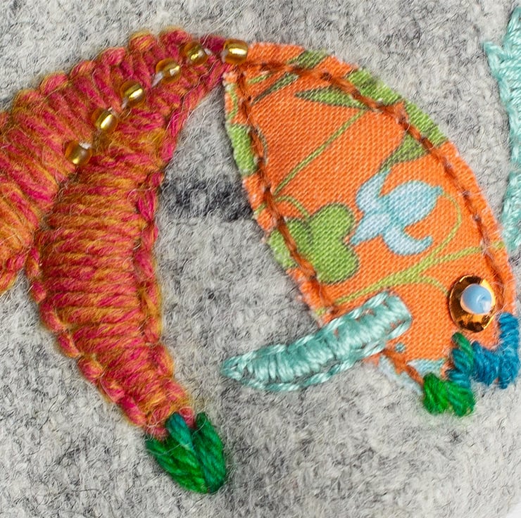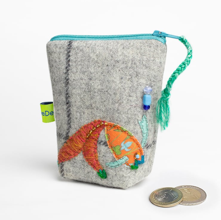 I have made this zipped coin purse/pouch in grey window pane check fabric. The pouch also has a hand embroidered fish on one side in orange and turquoise, beads have been added for detail. It is lined in up cycled scarf fabric. The contrasting zip is turquoise colour and I have also added a turquoise plaited zip pull. The bag has a shaped base so that it stands up and it it easier to find your items. The purse measures 3.5" by 3.5"/7cm by 7cm.