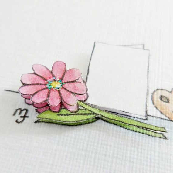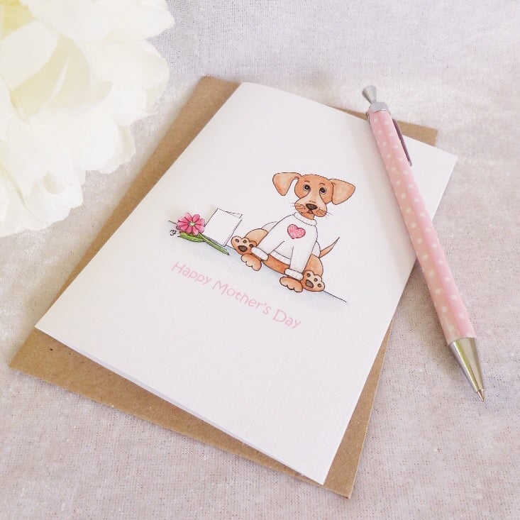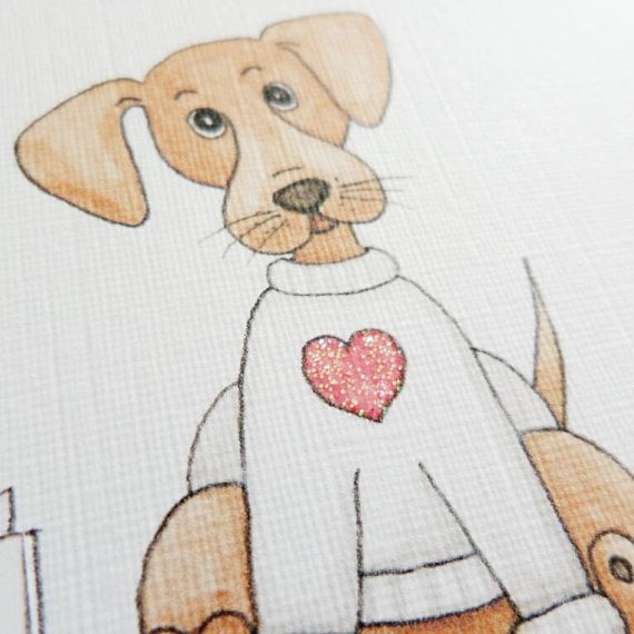 This cute dachshund dog card has been designed using my own original watercolour illustration. The card has been printed out onto good quality linen embossed card and decoupaged up in parts. The card has been finished off with a little glitter detail.
