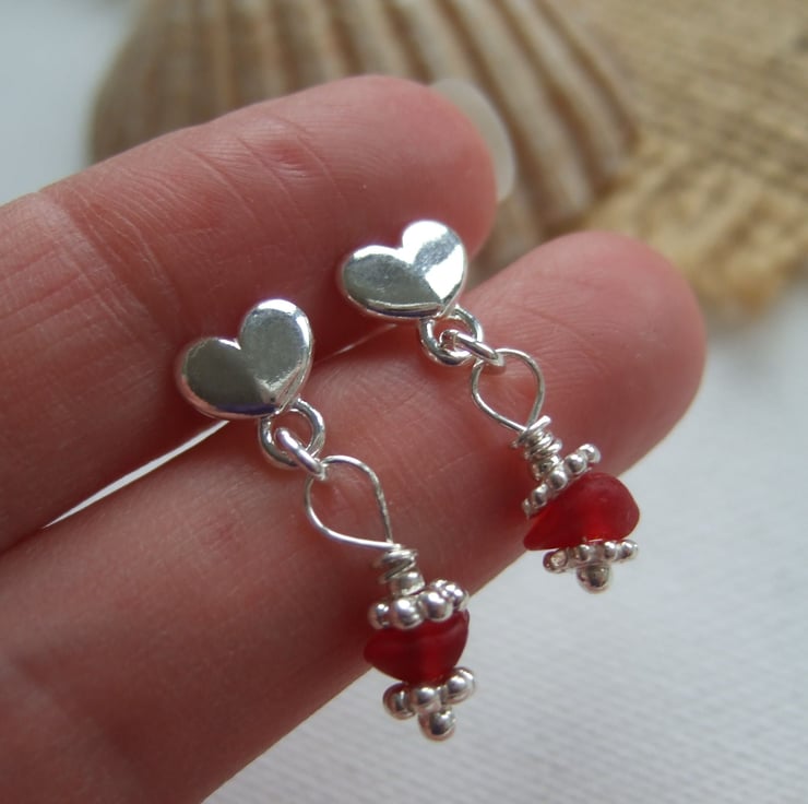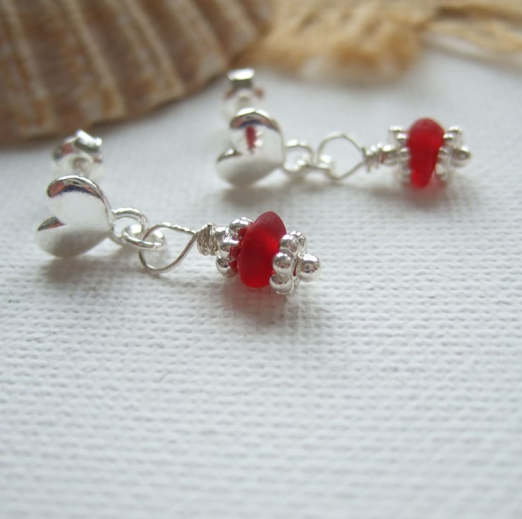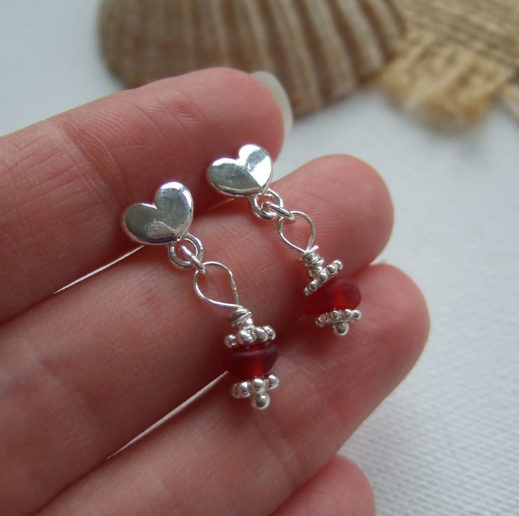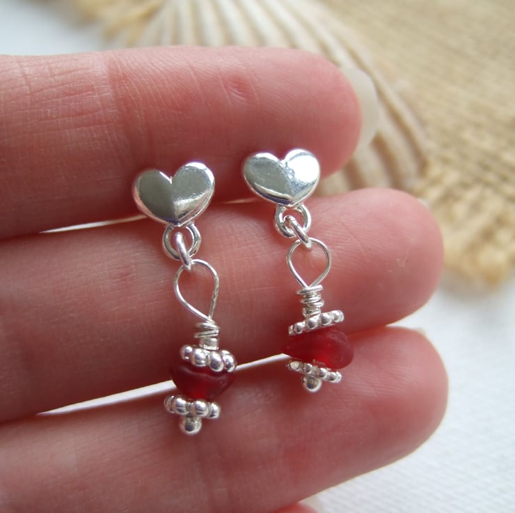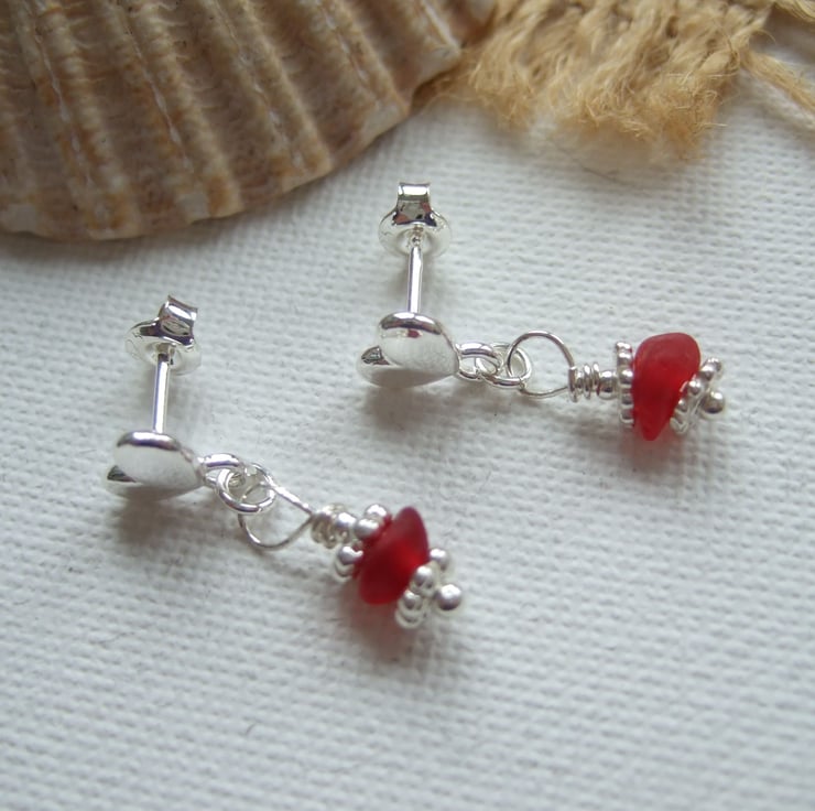 Striking cherry red sea glass captured in sterling silver! Seaham sea glass in red on heart stud design settings with sterling silver beads. Amazing little gems - a treasure from the Sea.