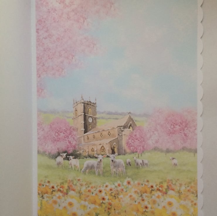 This is a lovely luxury 3D greeting card to say Happy Easter. The design features cute lambs and daffodils outside a church.
