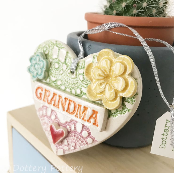 This ceramic heart decoration is made from white earthenware clay and decorated with a lace pattern and bright colour. It is finished in a clear glaze, fired in the pottery kiln up to 1100 degrees. It hangs from a silver coloured ribbon. 7.5cm x 7cm x 1cm deep