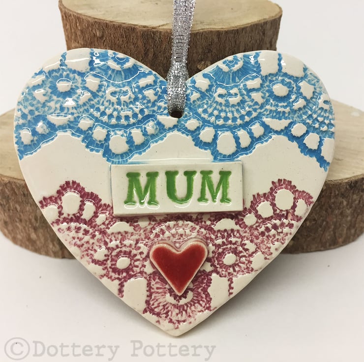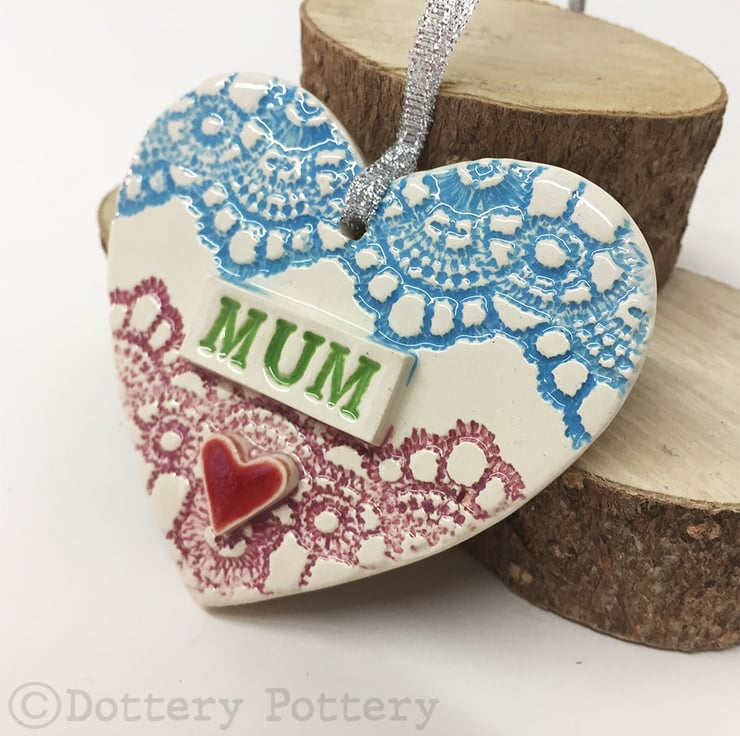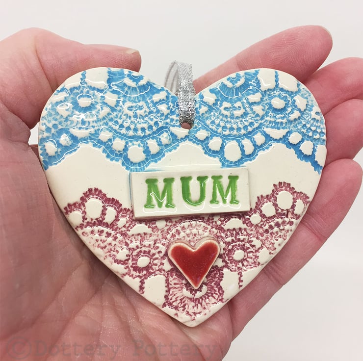 This ceramic heart decoration is made from white earthenware clay and decorated with a lace pattern and bright colour. It is finished in a clear glaze, fired in the pottery kiln up to 1100 degrees. It hangs from a silver coloured ribbon. 7.5cm x 7cm x 1cm deep