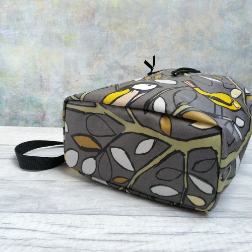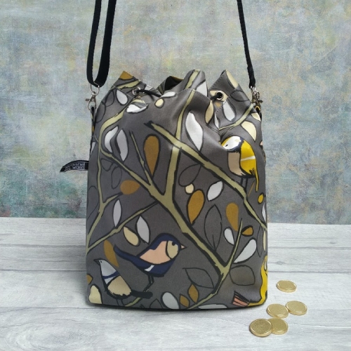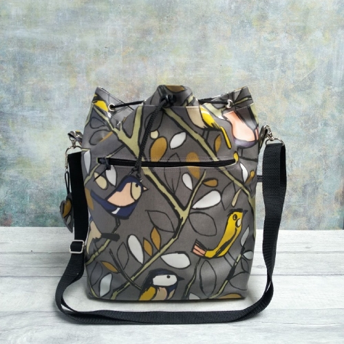 This roomy bucket bag has been designed and handmade with careful attention to detail using an unusual quirky bird design oilcloth carefully complemented with a batik style cotton fabric lining.