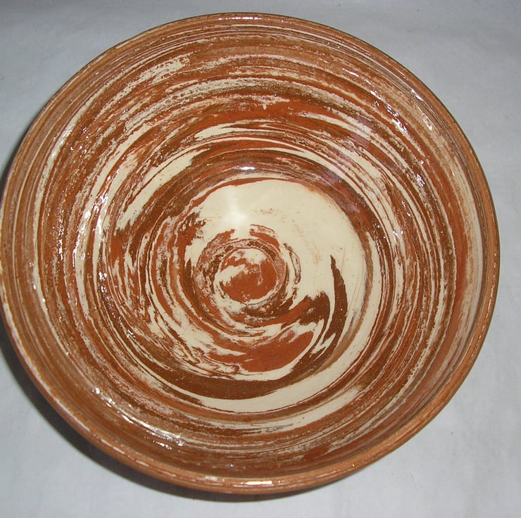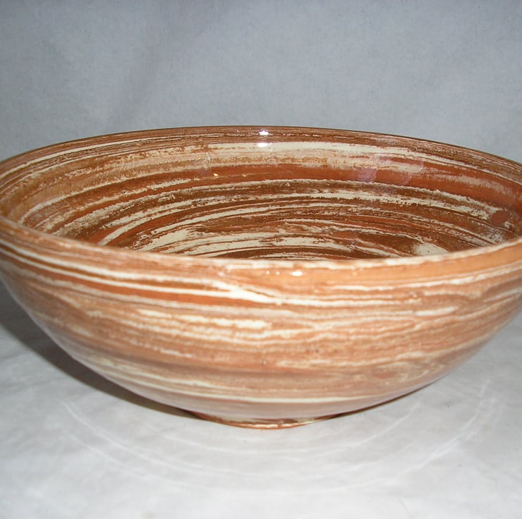 THIS IS A BOWL THROWN ON MY WHEEL. IT SHOWS HOW THE THREE COLOURS OF CLAY HAVE COMBINED IN THE THROWING PROCESS. THE DIAMETER IS 23 CMS AND THE HEIGHT IS 9 CMS.