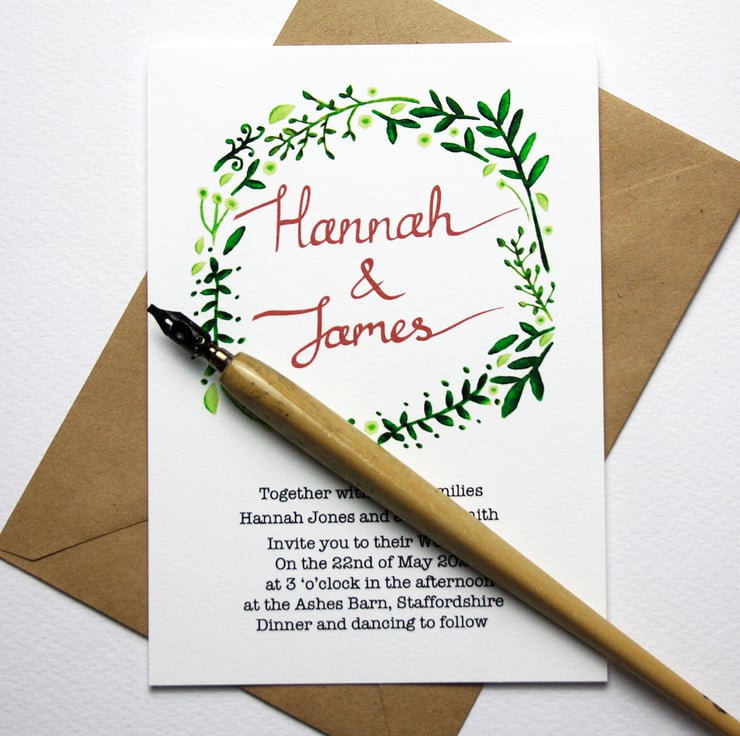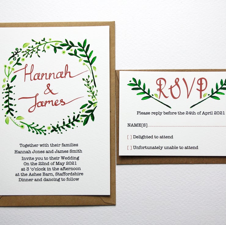 Simple and pretty fern wedding invitation set, featuring my watercolour leaf design with personalised calligraphy for names and a lovely simple font for details.