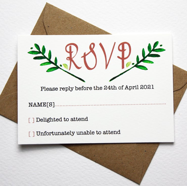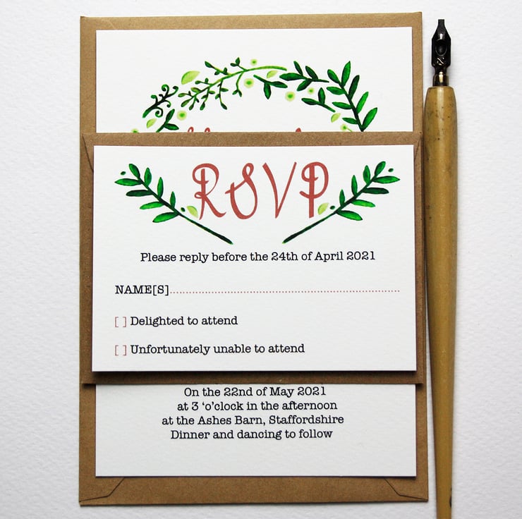 -A7 size RSVP 105x74mm with a matching recycled kraft envelope.